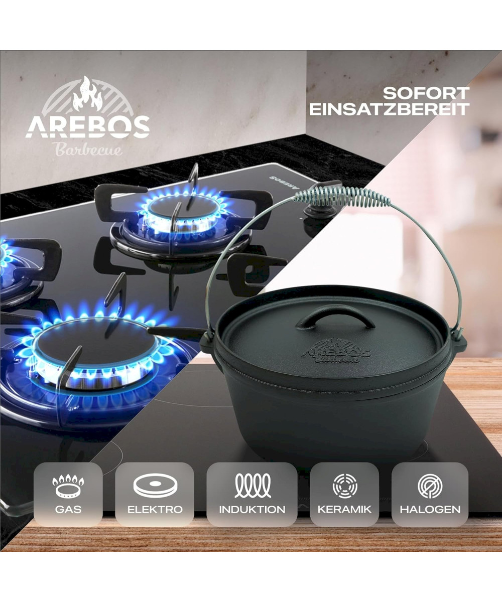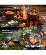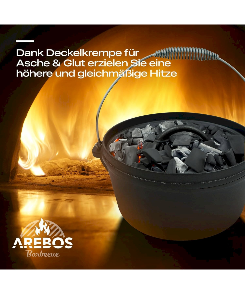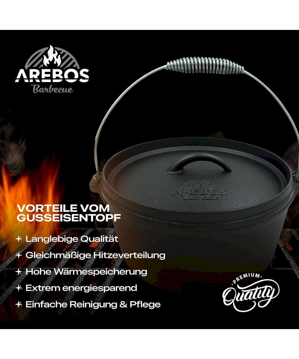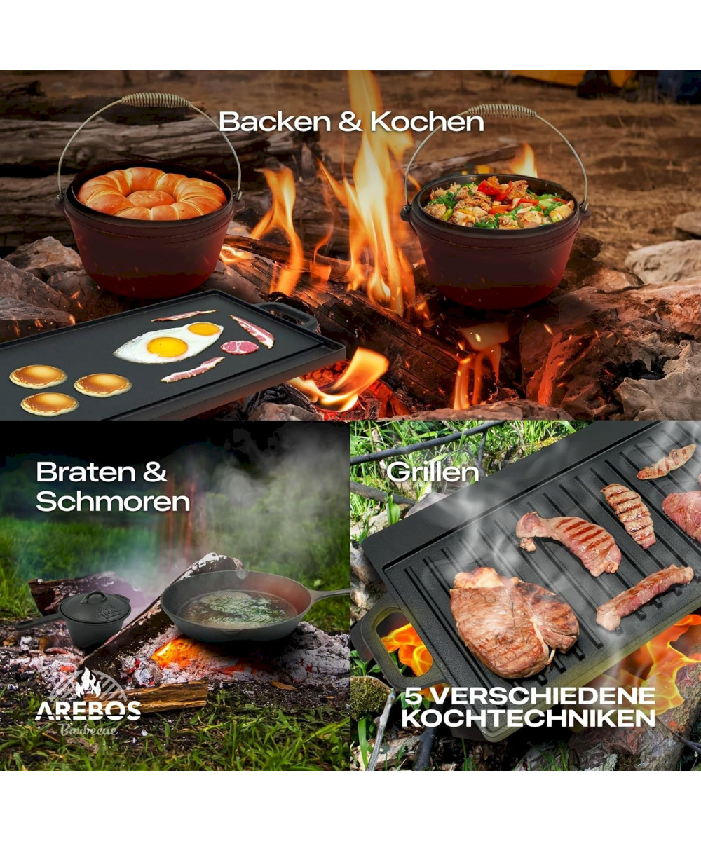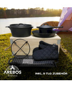 Das Dutch Oven Set von AREBOS bietet vielseitige Einsatzmöglichkeiten. Sie können ihn zu Hause, im Garten oder natürlich auch beim Campen nutzen.