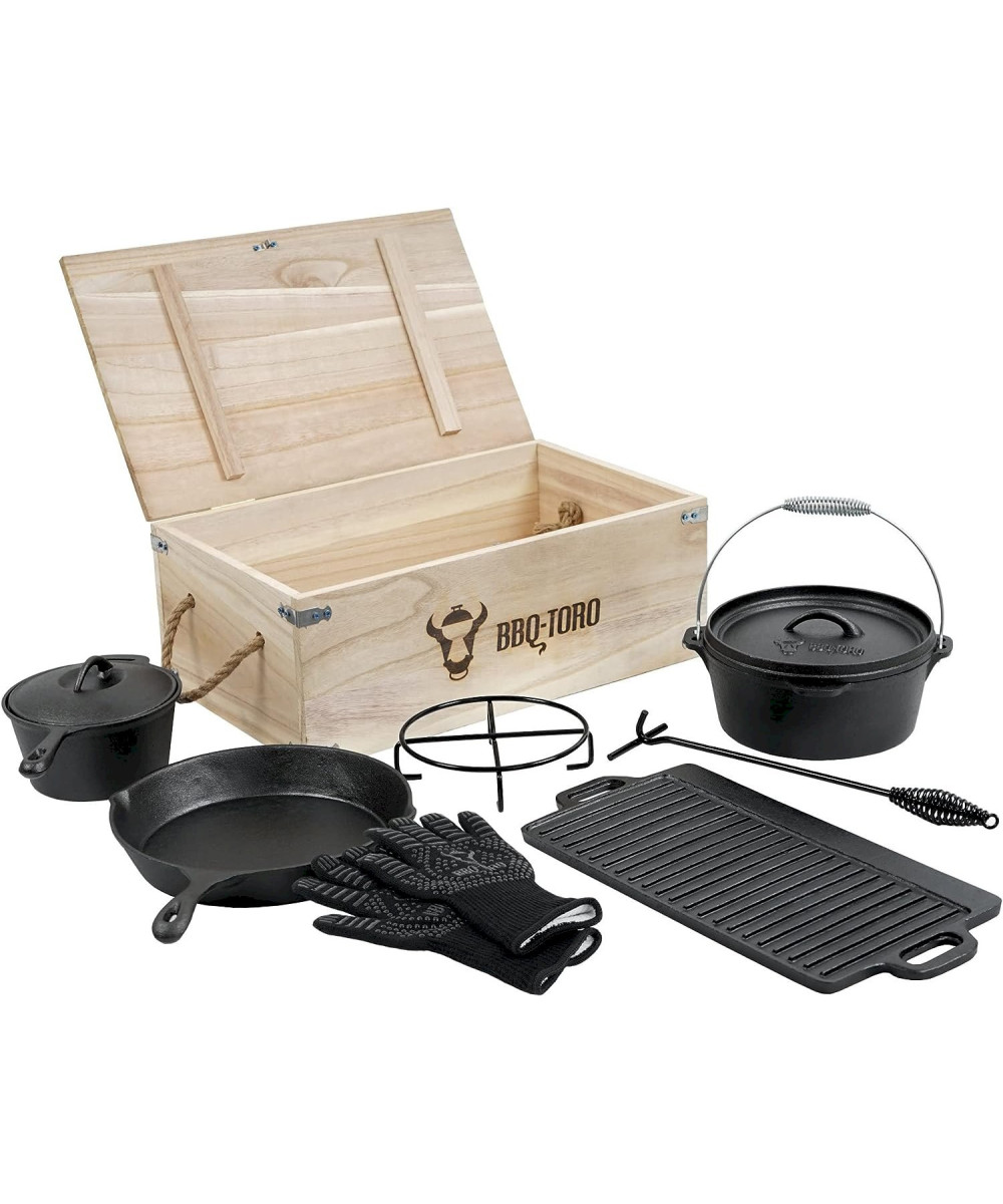 BBQ-Toro 8-teiliges Dutch Oven Set mit Holzkiste und viel Zubehör