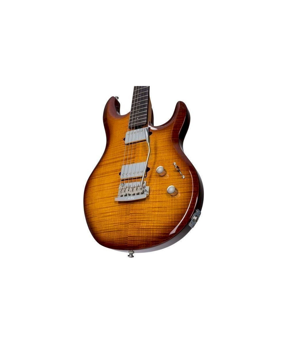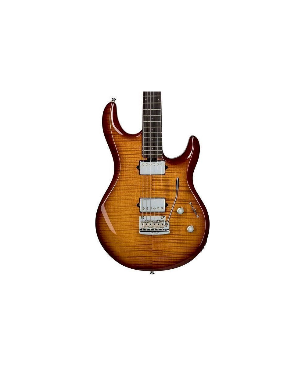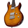 Die Sterling by Music Man LK100 Steve Lukather Signature E-Gitarre in der Farbe Hazel Burst besitzt einen Korpus aus Lindenholz sowie ein Griffbrett aus Palisander und einen Hals aus Roasted Hard Ahorn. Durch seinen HH Tonabnehmer bringt einen starken sowie einen sehr klaren Sound.