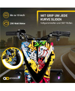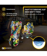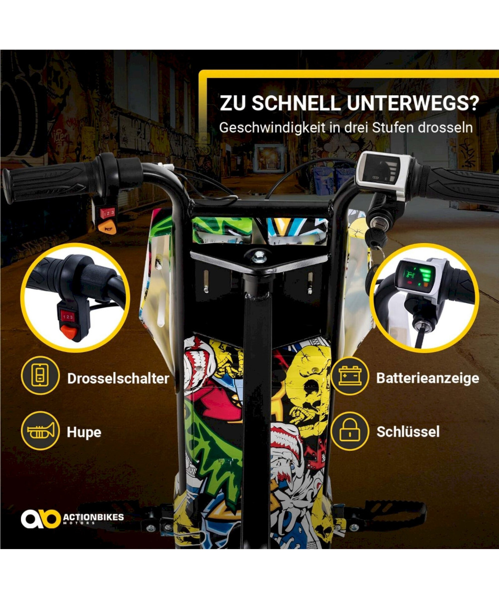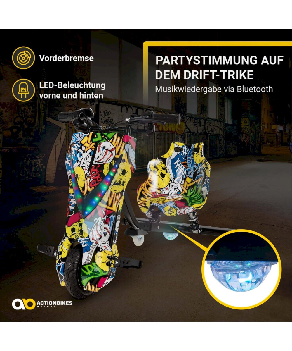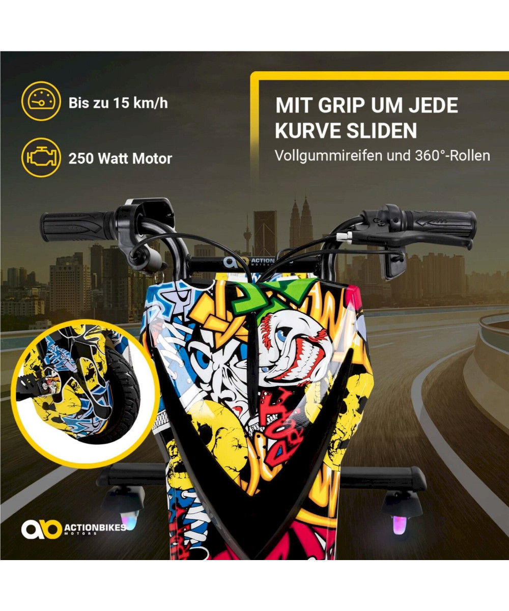 Kinder stecken voller Abenteuerlust und Entdeckergeist: Das Elektro-Drift-Trike von Actionbikes liefert genau dafür den perfekten Stoff! Spaßige Stunden und eindrucksvolle Tricks sind garantiert. Denn die speziellen 360°-Rollen am Trike ermöglichen rasante Drifts. Mit dem 250-Watt-Motor erreicht der Drift-Scooter eine Geschwindigkeit von bis zu 15 km/h. Aber keine Sorge – die Sicherheit Ihrer Sprösslinge haben Sie trotzdem stets im Blick: Denn mithilfe des Drosselschalters bestimmen Sie die Geschwindigkeit des Elektro-Drift-Trikes für Kinder. Und auch eine Hupe sowie eine Vorderbremse sind am Drift-Trike vorhanden. Dem sicheren Spaß steht also nichts mehr im Wege: Mit blinkenden LED-Rollen, leuchtender Front, peppiger Musik und auffälligem Design lässt der Elektro-Drift-Scooter Kinderherzen höherschlagen.