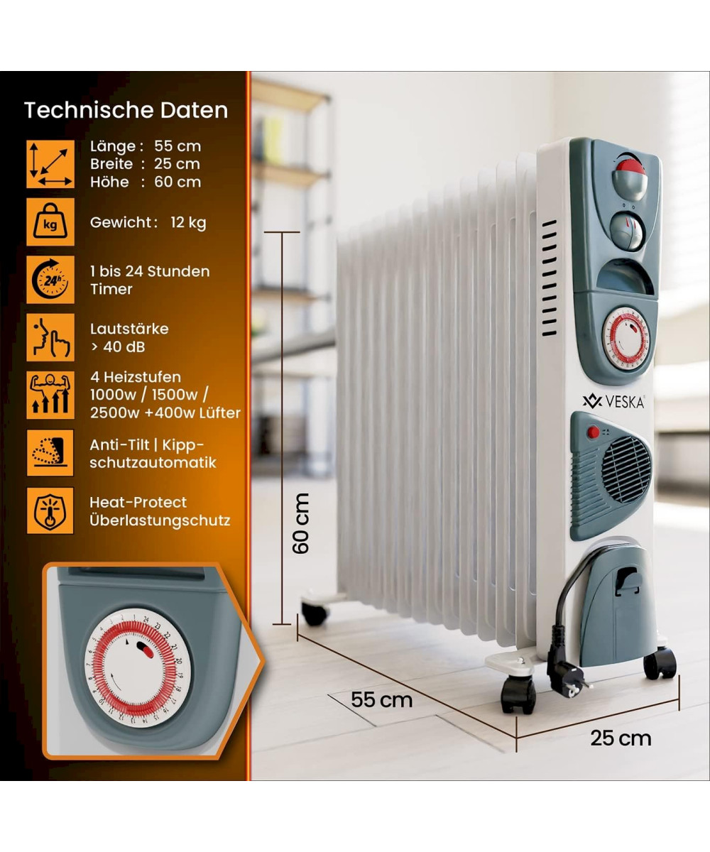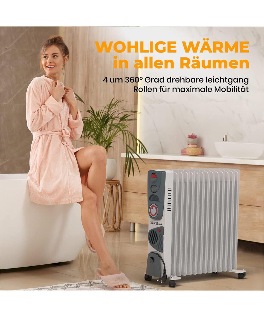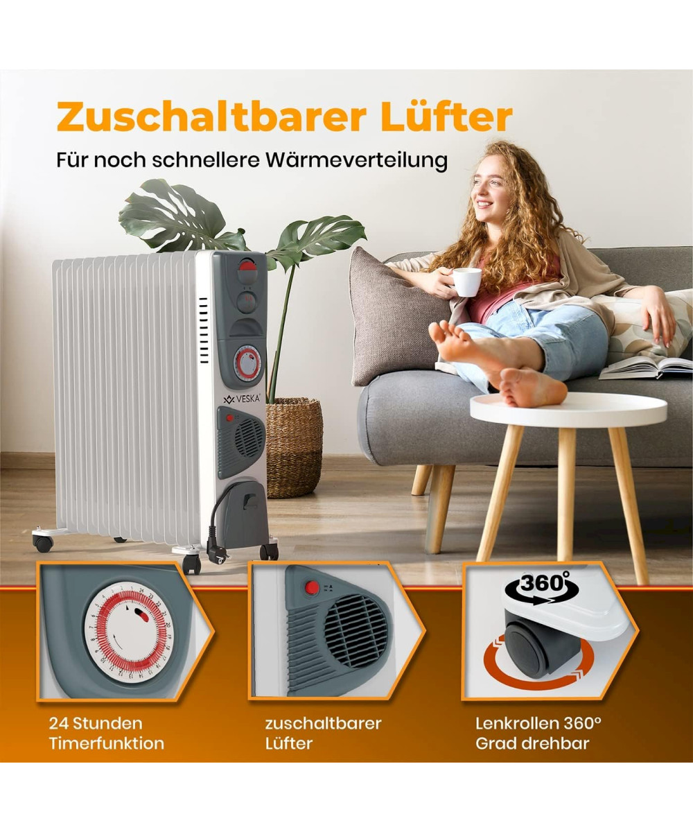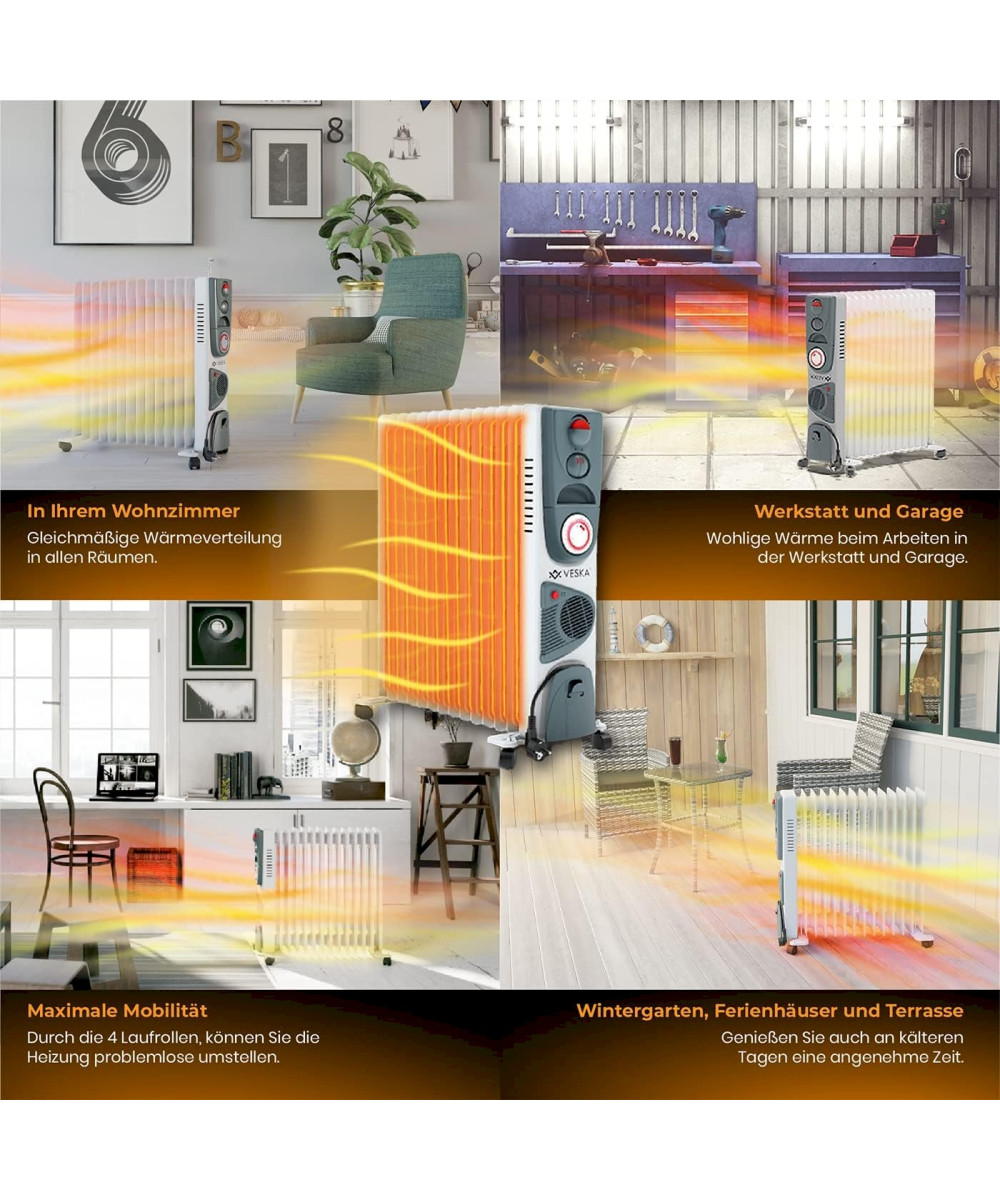 Der elektrisch betriebene Öl Radiator 2900W von VESKA® verfügt über 3 Heizstufen (1000W/1500W/2500W), sowie einen integrierten Heizlüfter (400W). Die 13 Heizplatten mit 5 Kammer-System sorgen für einen sehr schnellen Aufheizvorgang gegenüber herkömmlichen Heizkörpern mit weniger Heizelementen oder weniger Kammern. Durch die große Heizfläche und den Wärmespeicher Öl, wird die Wärme auch nach dem Abschalten der Heizung noch lange und gleichmäßig an den Raum abgegeben. Der zuschaltbare Heizlüfter sorgt für eine schnelle Wärmeverteilung im gesamten Raum. Über den stufenlosen Thermostatregler, können Sie die gewünschte Raumtemperatur einfach einstellen. Der Integrierter 24 Stunden Timer, ermöglicht Ihnen die Heizung noch effizienter zu nutzen und Energie zu sparen. So können Sie die Heizung nach Ihren Vorgaben mehrmals am Tag automatisch Ein- bzw. Ausschalten lassen, z.B. in der Nacht wenn Sie schlafen oder wenn Sie tagsüber das Haus verlassen. Durch die integrierten Laufrollen, ist die Heizung sehr flexibel einsetzbar und kann einfach von Raum zum Raum geschoben werden. Ob im Wohnzimmer, Schlafzimmer, der Werkstatt oder in der Garage, der VESKA® Ölradiator ist vielseitig einsetzbar.