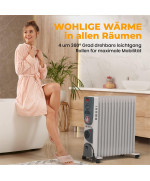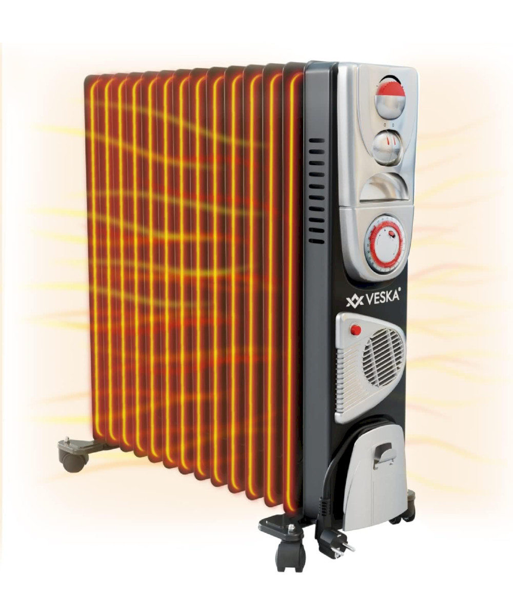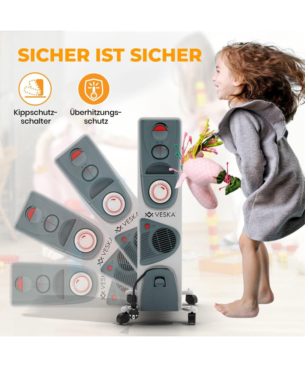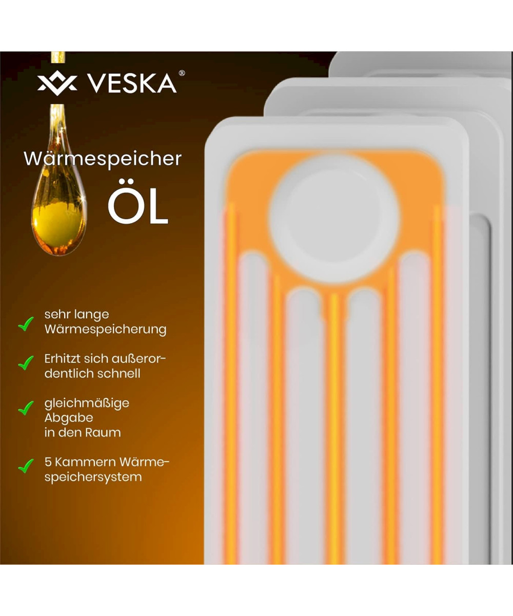 Der elektrisch betriebene Öl Radiator 2900W von VESKA® verfügt über 3 Heizstufen (1000W/1500W/2500W), sowie einen integrierten Heizlüfter (400W). Die 13 Heizplatten mit 5 Kammer-System sorgen für einen sehr schnellen Aufheizvorgang gegenüber herkömmlichen Heizkörpern mit weniger Heizelementen oder weniger Kammern. Durch die große Heizfläche und den Wärmespeicher Öl, wird die Wärme auch nach dem Abschalten der Heizung noch lange und gleichmäßig an den Raum abgegeben. Der zuschaltbare Heizlüfter sorgt für eine schnelle Wärmeverteilung im gesamten Raum. Über den stufenlosen Thermostatregler, können Sie die gewünschte Raumtemperatur einfach einstellen. Der Integrierter 24 Stunden Timer, ermöglicht Ihnen die Heizung noch effizienter zu nutzen und Energie zu sparen. So können Sie die Heizung nach Ihren Vorgaben mehrmals am Tag automatisch Ein- bzw. Ausschalten lassen, z.B. in der Nacht wenn Sie schlafen oder wenn Sie tagsüber das Haus verlassen. Durch die integrierten Laufrollen, ist die Heizung sehr flexibel einsetzbar und kann einfach von Raum zum Raum geschoben werden. Ob im Wohnzimmer, Schlafzimmer, der Werkstatt oder in der Garage, der VESKA® Ölradiator ist vielseitig einsetzbar.