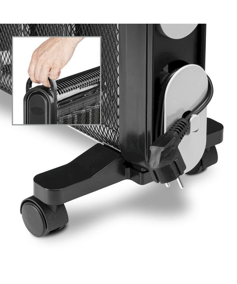 Dank seiner kompakten Abmessungen, den integrierten Leichtlaufrollen und den praktischen Handgrifffen lässt sich der Wärmewellenheizer TCH 2050 E schnell und einfach von einem Raum in den anderen fahren oder tragen. So bleiben Sie flexibel und können ihn wahlweise im Büro, in Wohn- und Geschäftsräumen oder z. B. im Wellnessbereich einsetzen. Die integrierte Kabelaufwicklung sorgt sowohl beim Transport als auch bei der Einlagerung für Ordnung und verhindert Stolperfallen.
