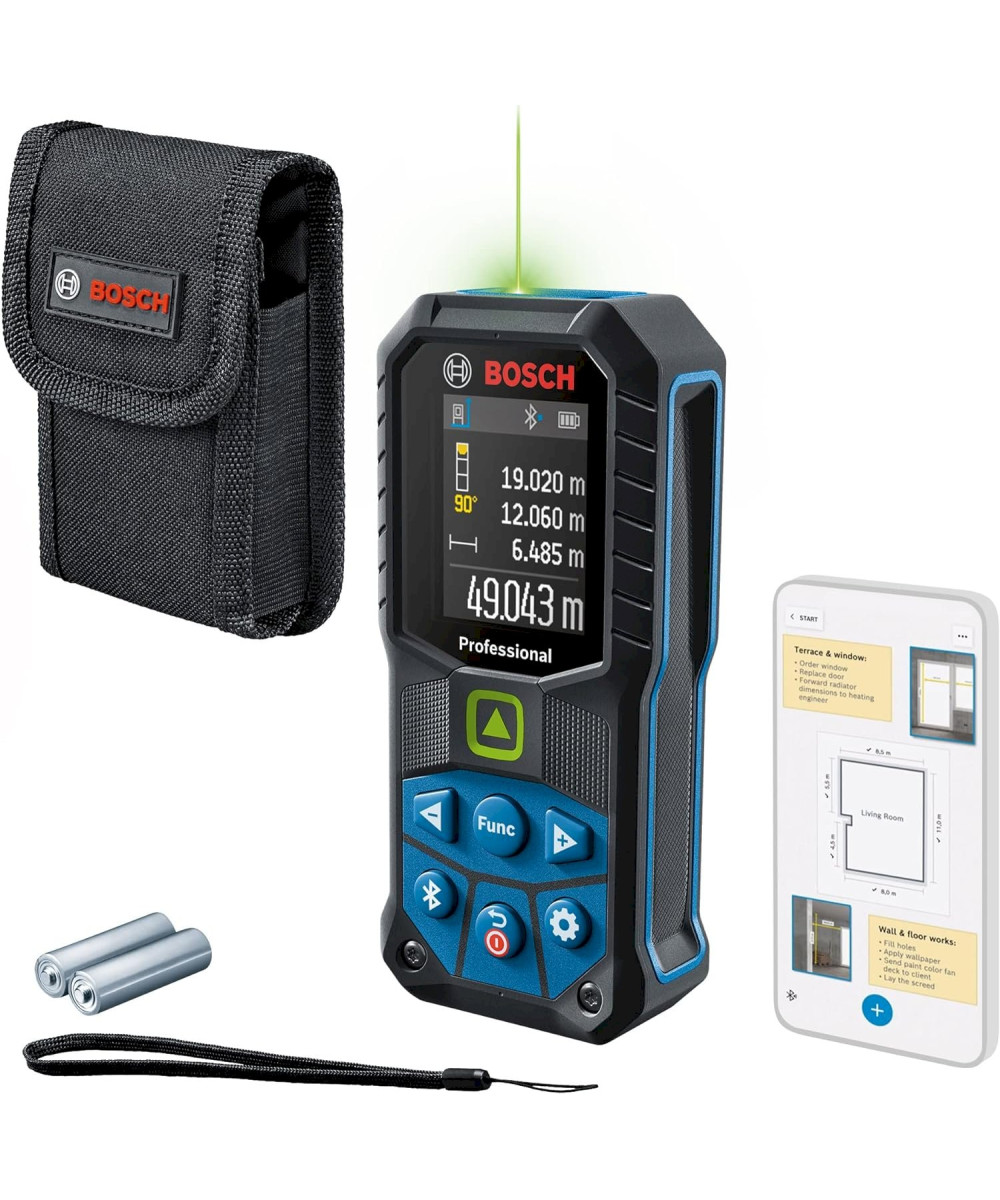 Der Laser-Entfernungsmesser GLM 50-27 CG Professional bietet eine hervorragende Sichtbarkeit des Laserpunkts, ein sehr langlebiges Design und eine schnelle Dokumentation. Da sein grüner Laserpunkt im Vergleich zu einem roten Laserpunkt besser zu sehen ist, eignet er sich besonders zum Messen großer Distanzen bei hellen Innenraumbedingungen. Dank der Kombination aus einem IP 65-zertifizierten Design und einem stoßabsorbierenden Gehäuse mit Gummiummantelung hält es Stürze aus 1,5 Meter Höhe, sogar auf harten Beton und auf rauen Baustellen aus. Bluetooth®-Konnektivität und die Bosch MeasureOn App gewährleisten eine zügige Dokumentation und blitzschnelle Übertragung der Messergebnisse.