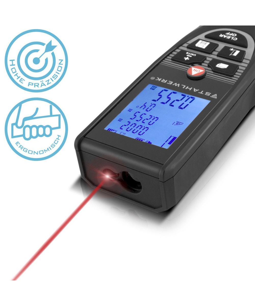 Der STAHLWERK LE-80 ST Laser-Distanzmesser arbeitet in einem Messbereich von 0 – 80 Metern mit einer Messgenauigkeit von + /- 1,5 mm. Der präzise Entfernungsmesser eignet sich zum Messen von Strecken sowie zur genauen Bestimmung von Rauminhalten. Das Laser-Messgerät verfügt zudem über ein indirektes Pythagoras-Messverfahren zur Berechnung von Höhen in Abhängigkeit zu den gemessenen Grundlängen. Somit eignet sich der Distanzmesser gut zur Bestimmung von Raumhöhen und Rauminhalten. Darüber hinaus lassen sich mit dem Messgerät Distanzen leicht addieren und subtrahieren. Die Messwerte können in den Einheiten Meter, Zoll und Fuß ausgegeben werden. Das Gerät ermittelt außerdem aus mehreren Werten das Minimum und Maximum. Der Laser-Entfernungsmesser liegt dank der ergonomischen Form des schlagfesten, gummierten Gehäuses aus ABS-Kunststoff gut in der Hand.