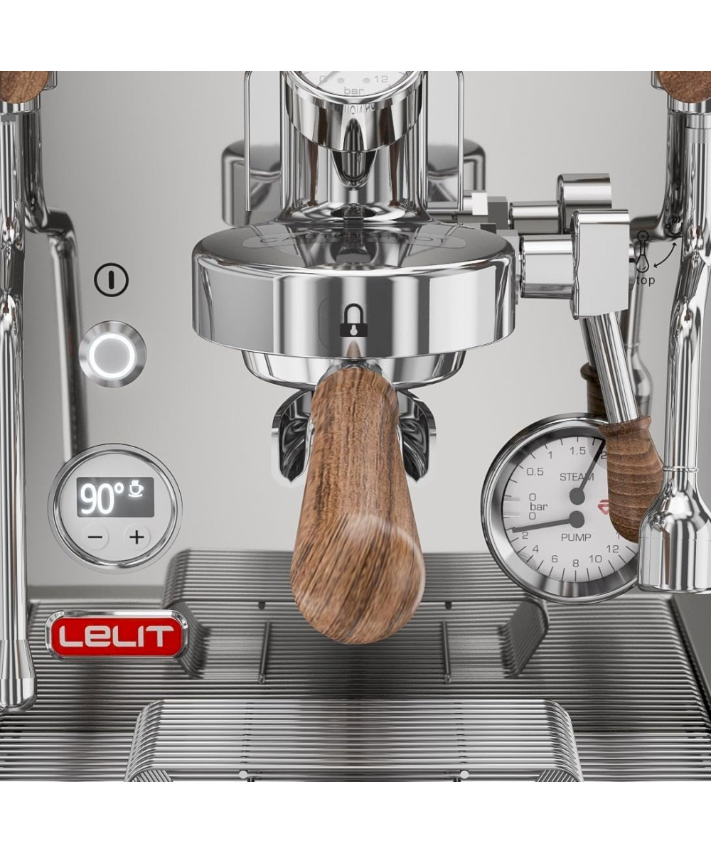 Das Paddle, die Drehknöpfe, die in Höhe verstellbare Füße, die Griffe und die Siebträger sind aus erlesenem Walnussholz (Edelstahl Version) / Ahornholz (farbige Version). Das Gehäuse, der Tank, das Drahtgitter und die Abtropfschale sind aus poliertem Edelstahl AISI 304, gewählt für lang anhaltende Ergebnisse und einfache Reinigung. Die farbige Versionen verfügen über ein farbiges Gehäuse mit texturiertem Finish und über ein Siebdruck-Logo. Geprüfte Qualitätsmaterialien, um die beste Leistung zu garantieren. - LELIT ELECTRONIC CONTROL SYSTEM