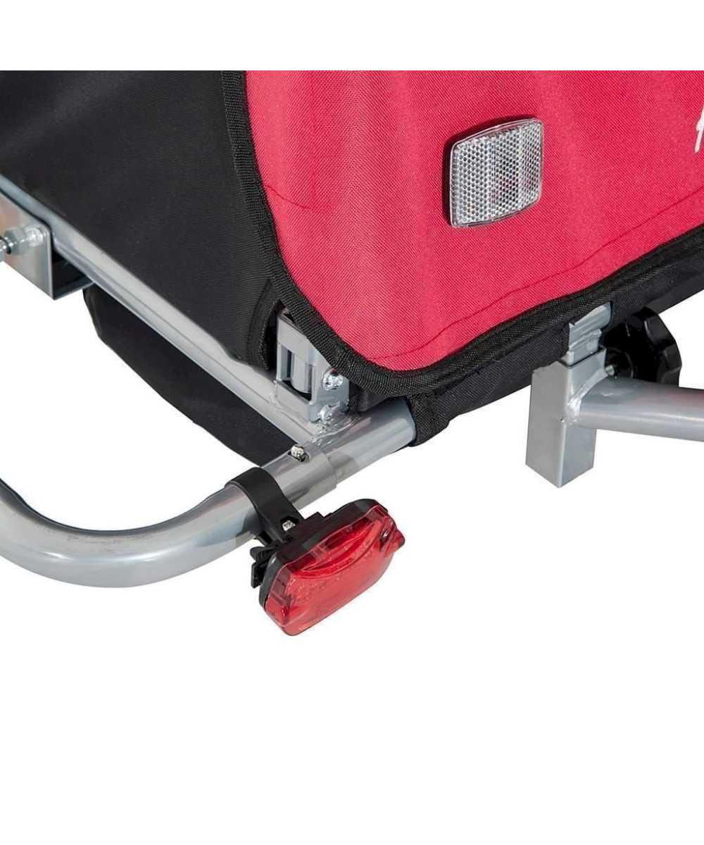 Unser Kinderfahrradanhänger ist Ihr treuer Begleiter für Spaziergänge, Einkaufsfahrten, Radtouren oder den Weg zum Kindergarten. Luftreifen und vollgefederte Hinterachse lassen auch Touren über Stock und Stein zu. Strapazierfähig und wasserabweisend ist der Außenbezug aus Oxfordstoff. Zusätzlich sind Regenschutz, Fliegengitter sowie ein 5-Punktgurt verbaut, sodass Ihr Kind sicher im Inneren des Kinderwagens untergebracht ist. Highlight des Anhängers ist seine 2 in 1 Funktion. Ohne komplizierte Umbauten und Werkzeug wird aus dem Fahrradanhänger ein schiebbarer Jogger. Für beste Sichtbarkeit sind an Vorder- und Rückseite zwei Reflektoren angebracht. Zusätzlich wird Ihr Jogger mit einem batteriebetriebenen Vorder- und Rücklicht ausgeliefert. Sorgenfrei durch den Alltag – mit unserem Kinderanhänger.