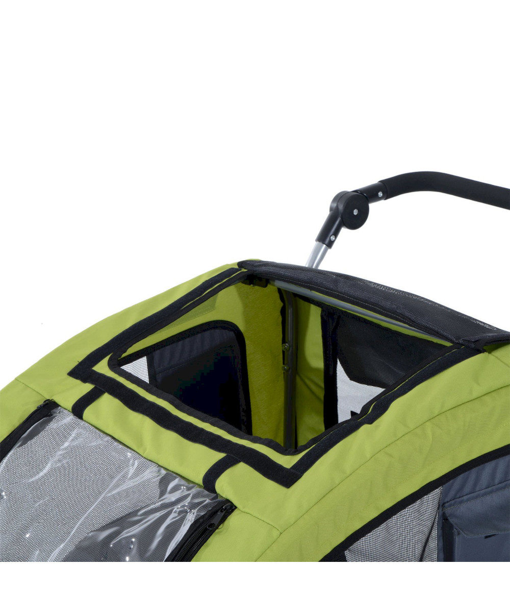 Doppelt praktisch: Mit diesem Fahrradanhänger für Tiere befördern Sie Ihre vierbeinigen Schützlinge sicher überallhin. Die voll gefederte Hinterachse und die luftgefüllten Reifen sorgen für eine sanfte Fahrt. Im Handumdrehen und ganz ohne Werkzeug wird aus dem Fahrradanhänger ein schiebbarer Haustierwagen.