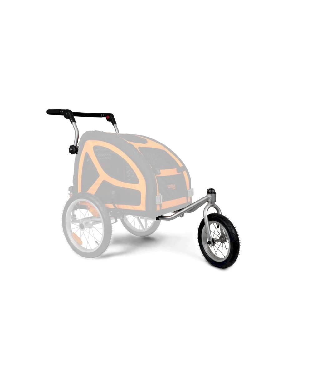 Hochwertiges Anbauset aus Aluminium, mit dem du deinen Fahrradanhänger DogBus S zum Schiebewagen umbauen kannst. Das Set besteht aus einem gepolsterten Handgriff, der mittels großer Handschrauben an den Seitenholmen befestigt und zu einem großen, soliden Handgriff verbunden wird. Der Handgriff ist durch ein Gelenk in der Höhe verstellbar. Die Fahrraddeichsel wird durch das Entfernen der Schnellspanner abgenommen und durch die Vorderradeinheit ersetzt. Die Vorderradeinheit besteht aus einem 12 Zoll luftgefederten Reifen, der über eine stabile Gabel im kugelgelagerten Turmdrehkranz verankert ist. Durch die Kugellagerung lässt sich der Hänger sehr leicht in jedem Gelände auf der Stelle drehen und manövrieren.
