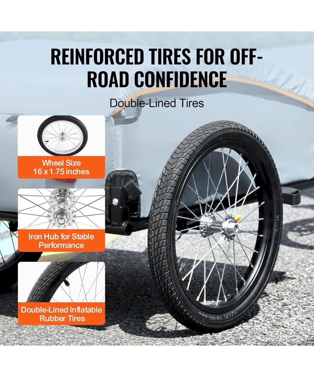 Professionelles Reifendesign: Rollen Sie sanft auf jeder Straße! Unser Fahrradanhänger ist mit sportlichen 16 x 1,75 Zoll / 40,64 x 4,45 cm großen Reifen und Eisennaben ausgestattet und bietet hervorragende Stabilität und Traktion auf verschiedenen Oberflächen, egal ob Sie auf Beton fahren, Schotterwege befahren oder Sandwege in Angriff nehmen.