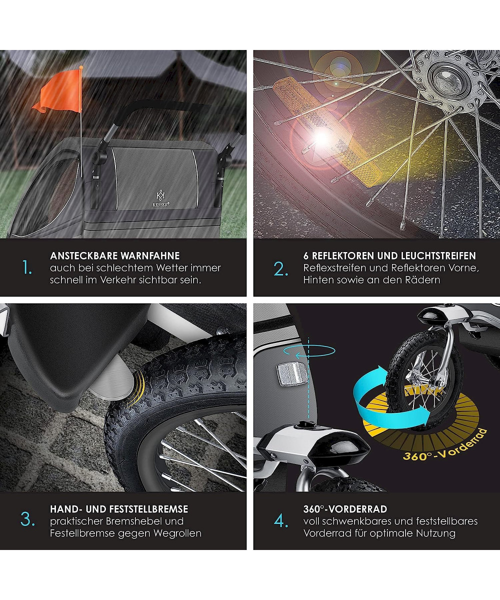 Reflexstreifen und Reflektoren Vorne, Hinten sowie am Aufbau garantieren eine optimale Sichtbarkeit und Sicherheit im Straßenverkehr. Die Hand- und Feststellbremse sowie das 360°-Vorderrad machen den Fahrradanhänger besonders leicht zu manövrieren und geben Ihnen die Kontrolle, die Sie benötigen. Der klappbare Griff sorgt für die perfekte Höhe und macht den Transport noch einfacher.