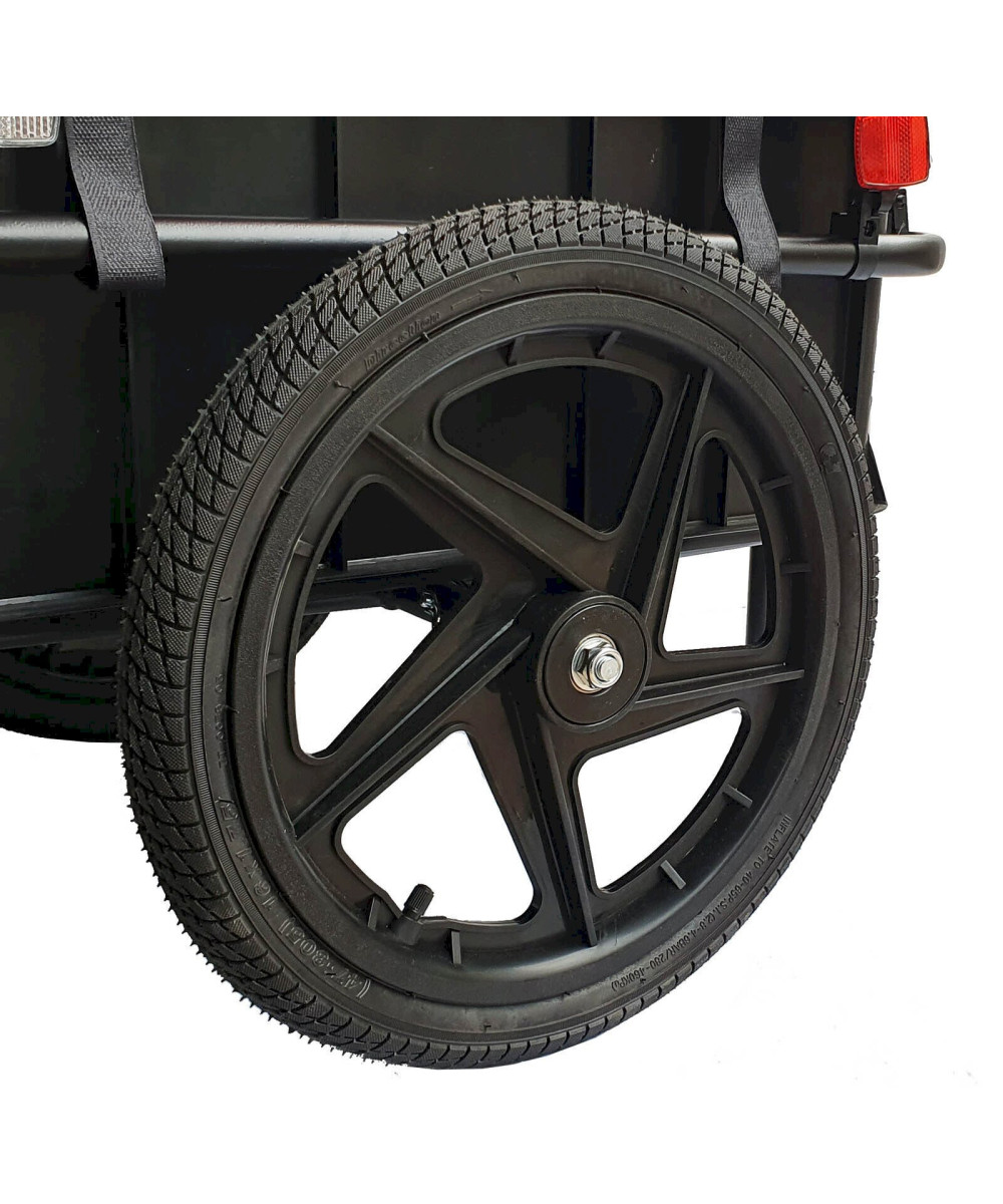Die robusten Reifen mit einem Durchmesser von 40 cm pro Rad sorgen dafür, dass der Anhänger problemlos auf nahezu allen Untergründen ruckelfrei fahren kann.