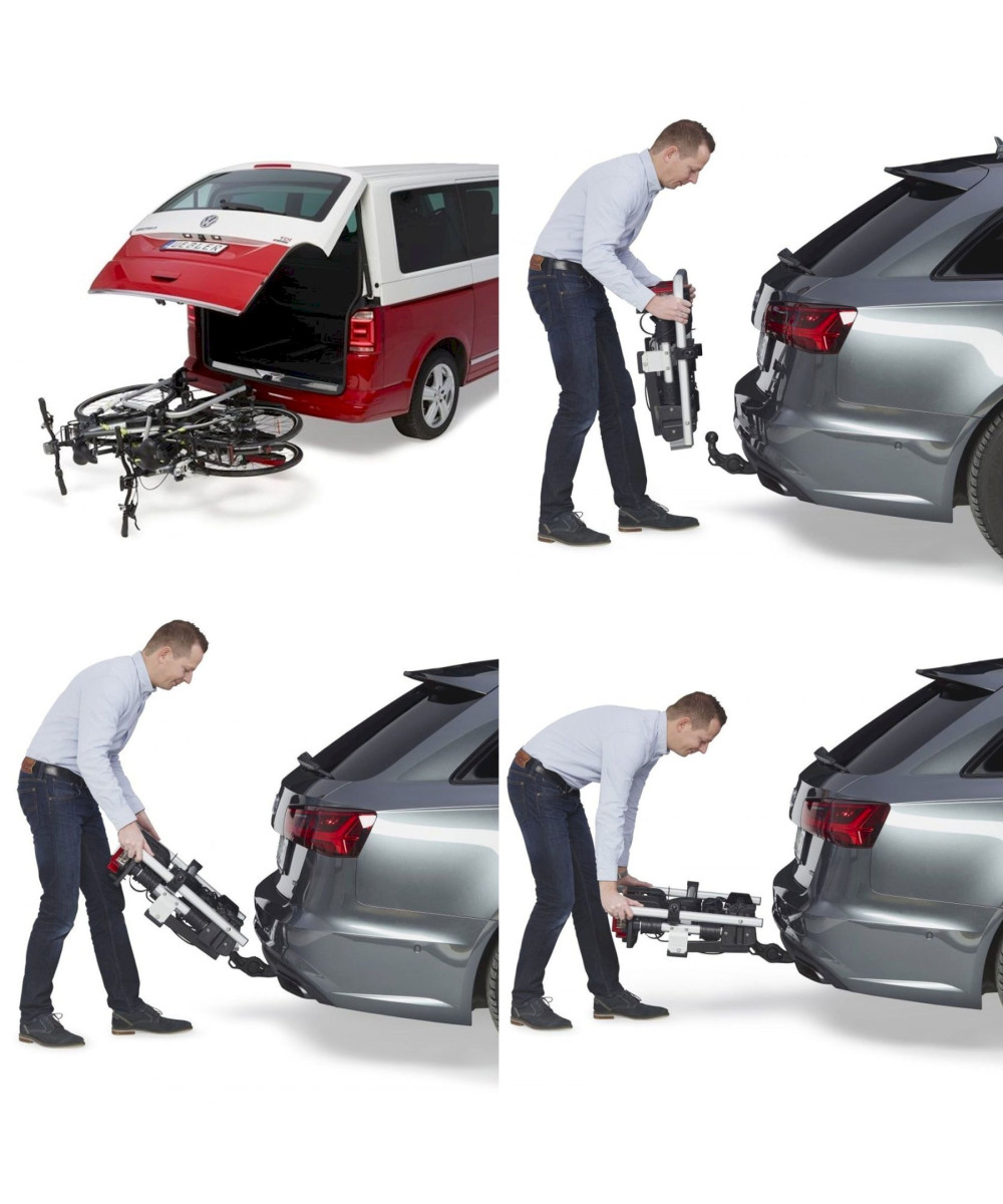 Mit Platz für bis zu zwei Fahrräder besitzt der Doppelträger ein erstaunlich geringes Faltmaß und lässt dir durch seine einfache Handhabung viel Raum für spontane Unternehmungen allein oder zu zweit. Erfreulich ist das geringe Eigengewicht des Trägersystems. Das kommt einerseits der Lastenbegrenzung der Anhängerkupplung zugute und erleichtert andererseits die Montage am PKW. Hier profitiert der Zweier-Träger auch vom hebellosen IQ-Verschluss, der das Anbringen besonders komfortabel gestaltet. Handlich zusammengefaltet wird der Träger auf die Kupplung gesetzt und ist nach dem Herunterklappen automatisch fixiert. Schnellspannhebel für den Trägerbügel sowie ausklappbare Schienen und Rücklichter machen ihn in wenigen Handgriffen einsatzbereit.