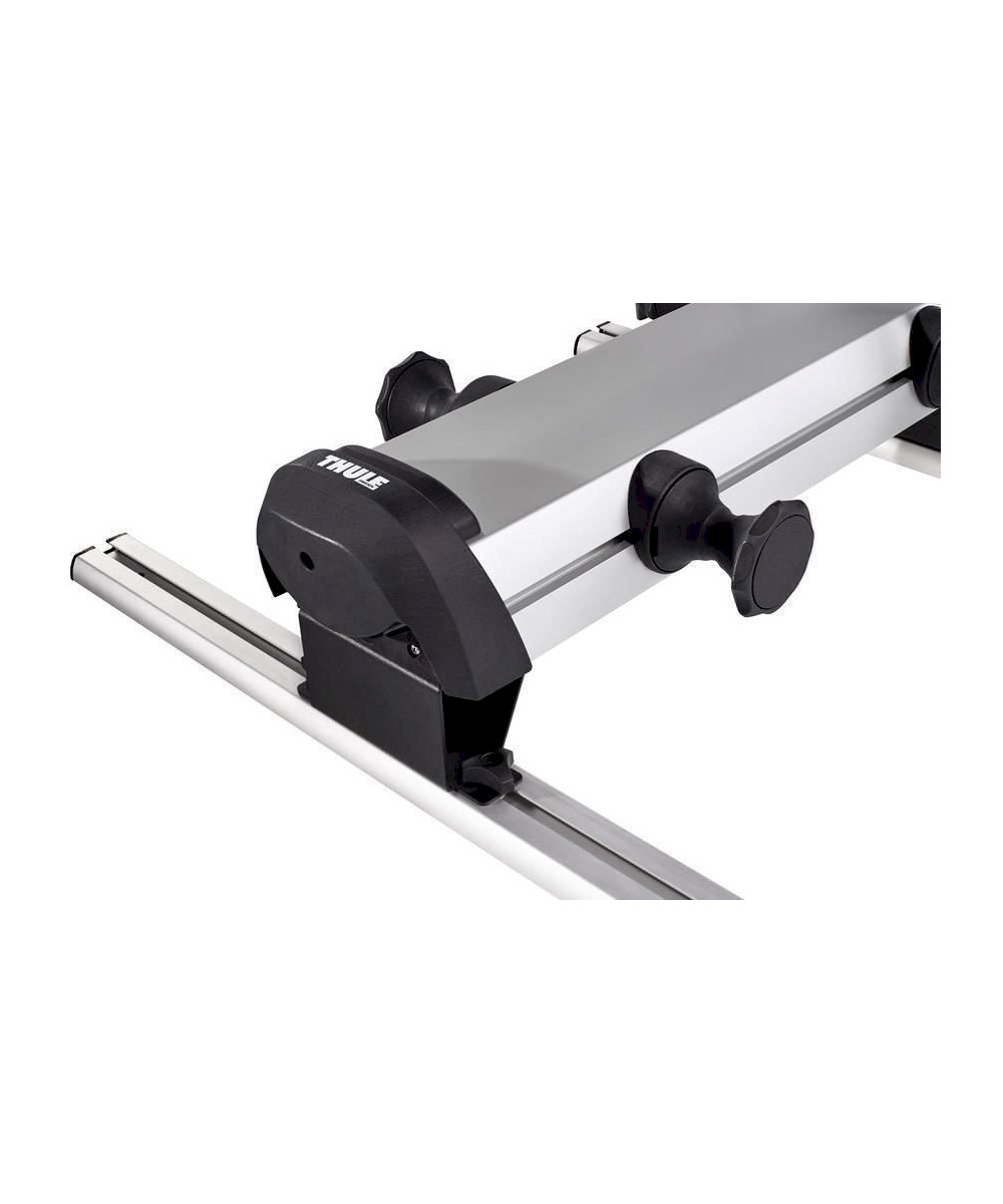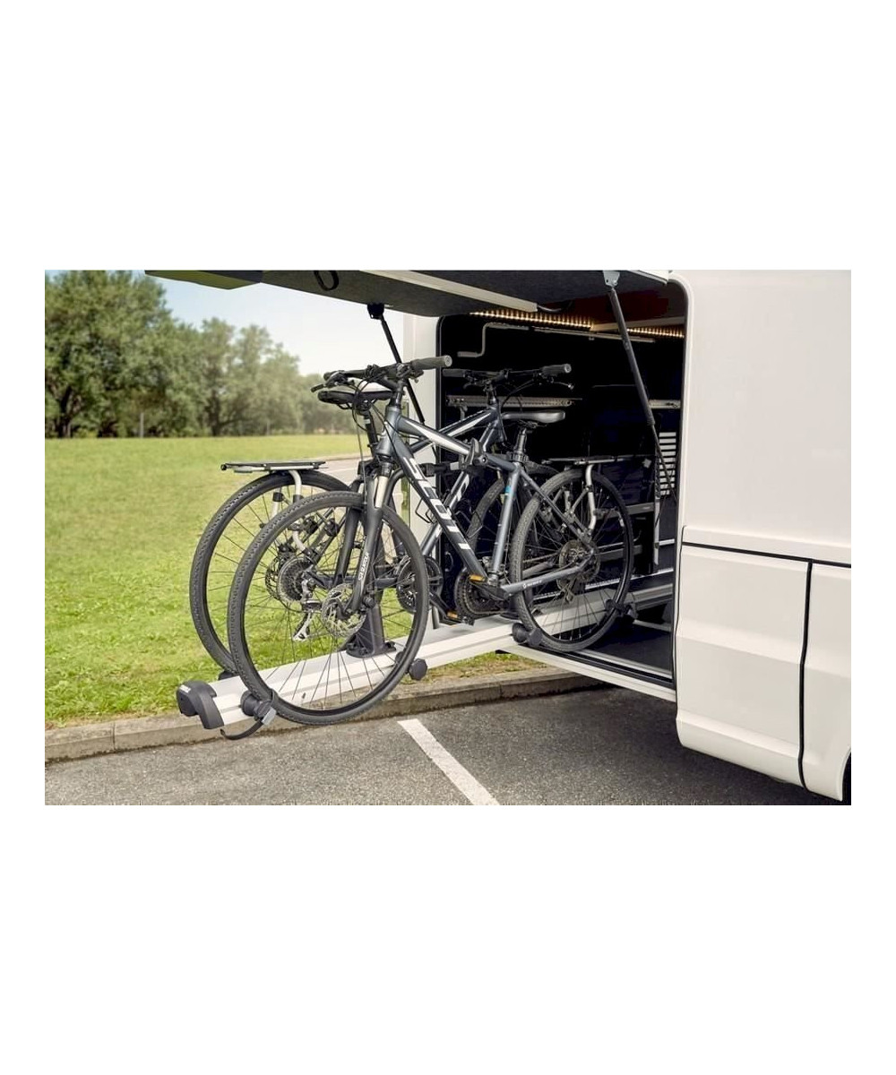 Mit dem Thule VeloSlide wurde ein Träger konstruiert, der in puncto Nutzerfreundlichkeit und Fahrzeugintegration seinesgleichen sucht. Das Grundprinzip ist ein leichtgängig gelagerter und von Hand herausziehbarer Grundträger mit einer maximalen Belastbarkeit von 70 kg an dessen beiden Seiten sehr flexibel jeweils ein Fahrrad oder ein E-Bike Platz findet: Nachdem der Grundträger waagerecht bis zu 1,5 m aus der Heckgarage herausgezogen wurde, können nun die mit einem Dreh verstell- und fixierbaren, konvexen Radaufnahmen an die jeweilige Radgröße angepasst und die Räder bequem aufgestellt werden. Robuste Haltearme und Radhalter dienen der Fixierung. Das Zurückschieben des Grundträgers in die Heckgarage kann schrittweise geschehen, um beispielweise zusätzliches Gepäck im Zwischenbereich zu platzieren. Sollte der Träger nicht benötigt werden, kann er platzsparend zur Seite geschoben oder herausgenommen werden.
