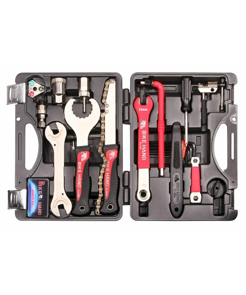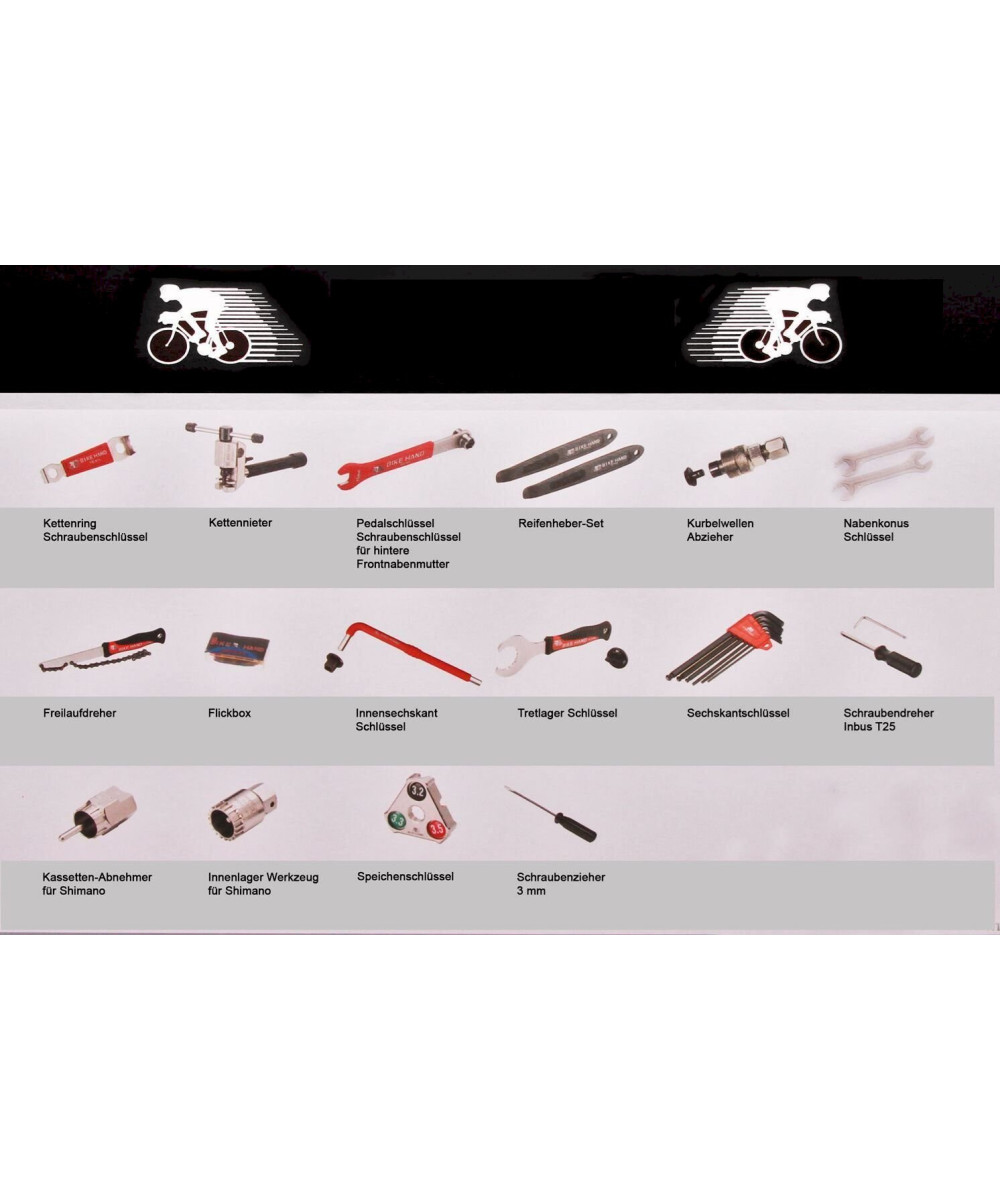 Das multifunktionale Bike Reparaturset enthält 25 der am meisten benötigten Werkzeuge zur Ausführung der Reparaturen aller Arten am Fahrrad.