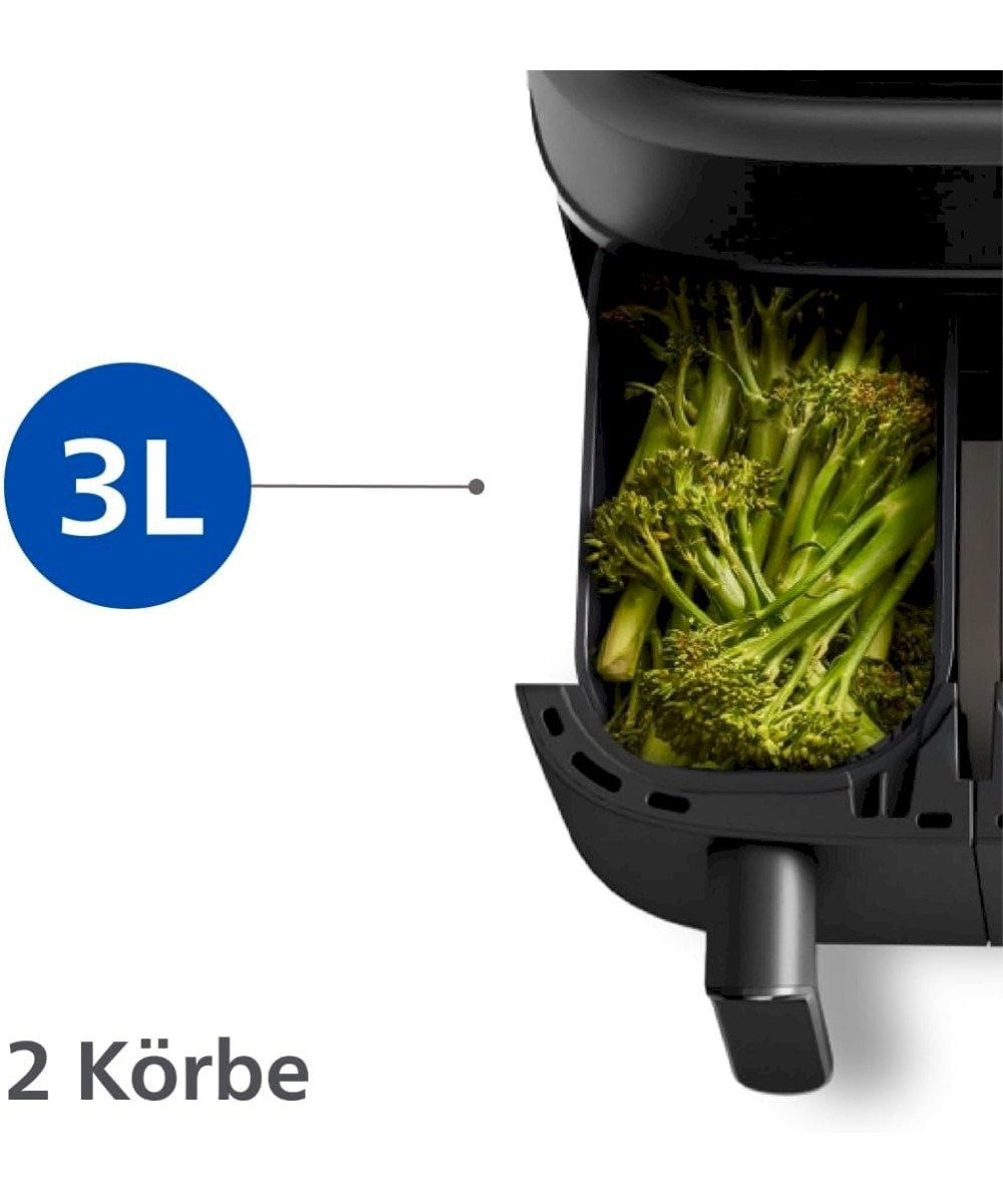 Mit dem Philips Airfryer 3000 Series Dual Basket bereitest du mühelos zwei köstliche Gerichte gleichzeitig zu. Die Gerichte werden auch bei unterschiedlicher Garzeit gleichzeitig fertig und können heiß serviert werden. Genieße leckeres, gesundes Kochen mit einem großen Korb für Familienessen oder Hauptgerichte einem kleineren Korb für Beilagen oder Mahlzeiten für weniger Personen.