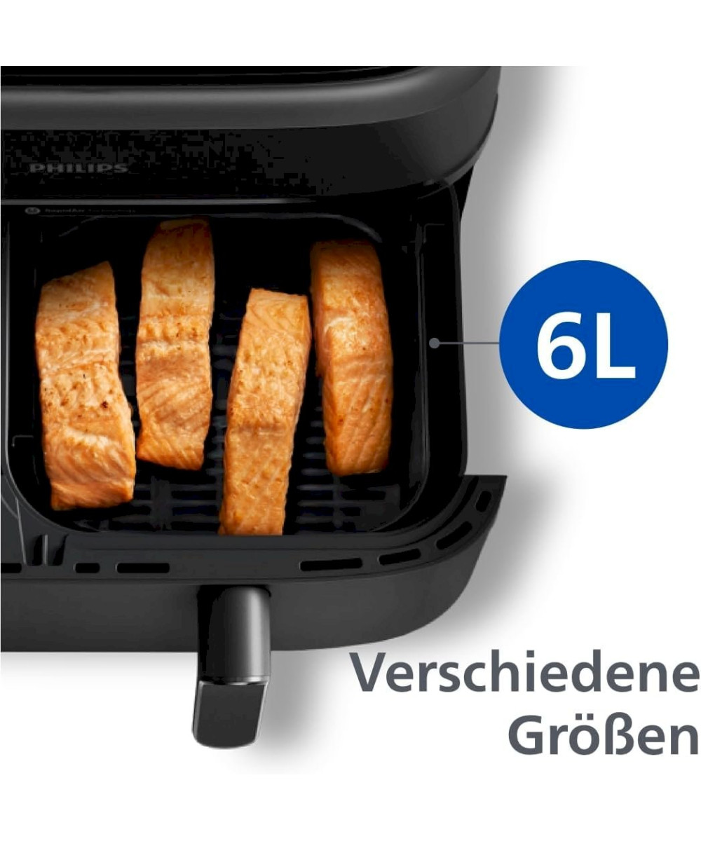 Der Airfryer mit der perfekten Familiengröße von insgesamt 9L . Bereite ganze Mahlzeiten im großen 6L Korb zu (z.B. bis zu 1,5 kg Rosenkohl oder ein 1,5 kg Hähnchen). Zusätzlich steht der kleine Korb mit weiteren 3L separat zur Verfügung.