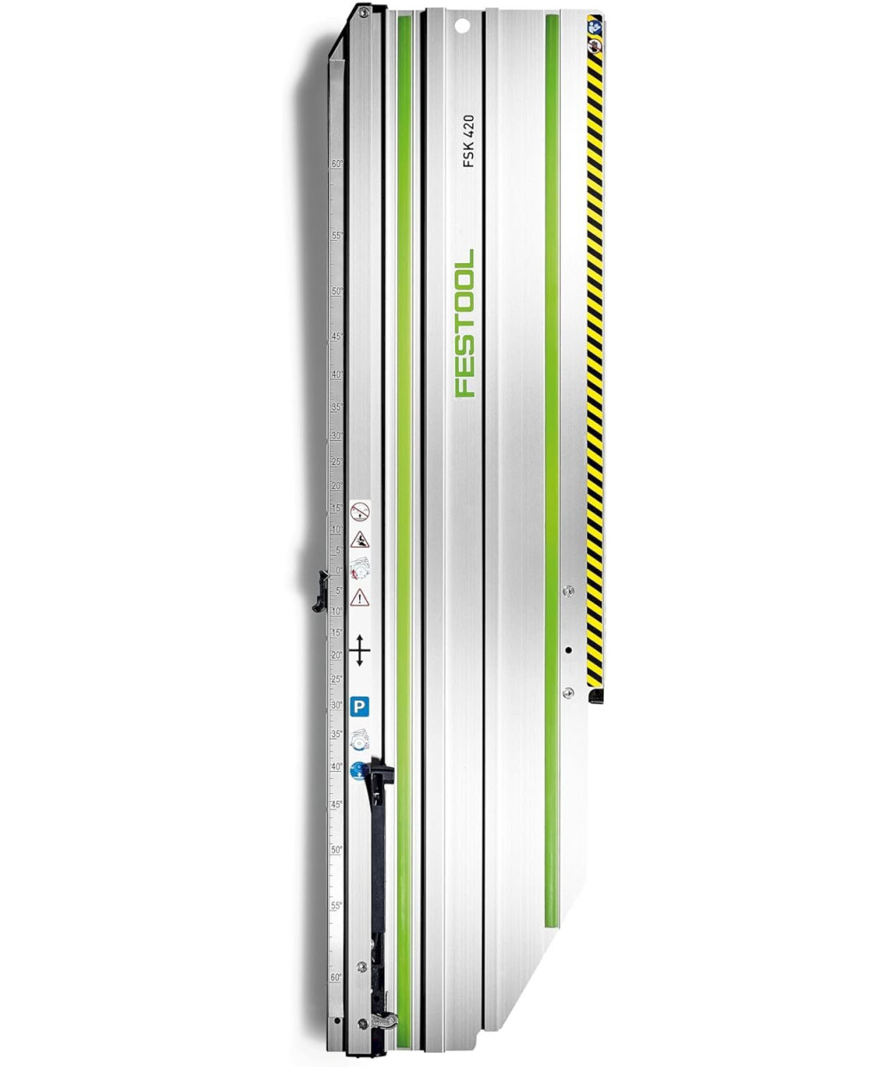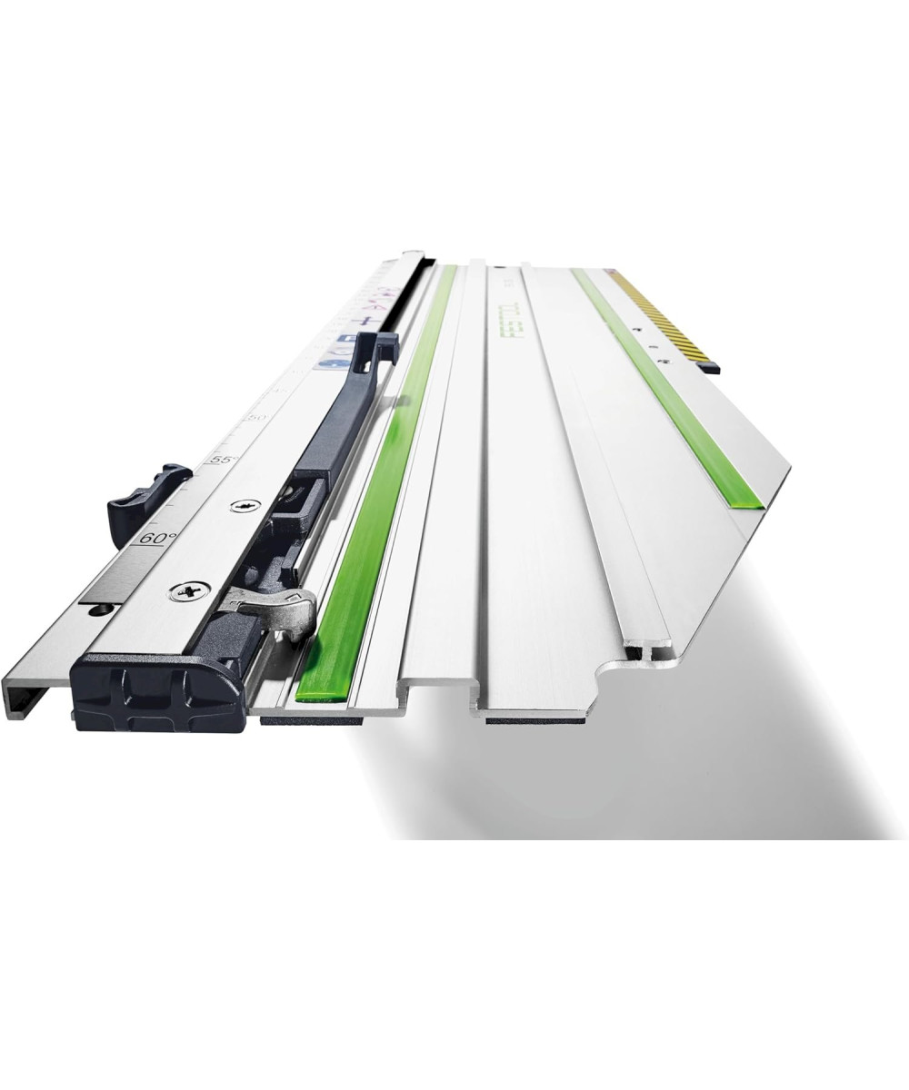 Koppelbare Kappschiene mit Schnellverschluss als ideale Ergänzung für die kompatiblen Handkreissägen und Tauchsägen.