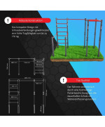 Der massive Stahlrahmen mit verschraubten Verbindungen hält Belastungen bis zu 150 Kilogramm stand. Die Pfosten werden tief im Fundament verankert und bieten auch bei intensiven Übungen einen sicheren Stand. Die Pulverbeschichtung schützt dauerhaft vor Rost und Witterungseinflüssen.