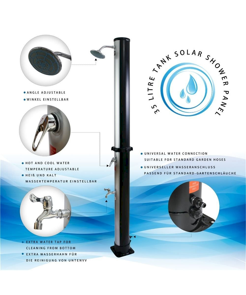 Sie möchten eine warme Dusche genießen und dabei sowohl die Umwelt als auch Ihren Geldbeutel schonen? Dann treffen Sie mit dieser Solardusche die richtige Wahl. Die Wassertemperatur lässt sich dank Einhebelmischbatterie stufenlos einstellen. Für besonderen Duschspaß sorgt der große Regenduschkopf mit Kugelgelenk. Ergänzt wird das Modell durch eine stabile, verschraubbare Bodenplatte. Freuen Sie sich auf stilvolles Design für Ihren Garten und umweltfreundliches Duschvergnügen - wann und wo Sie möchten!