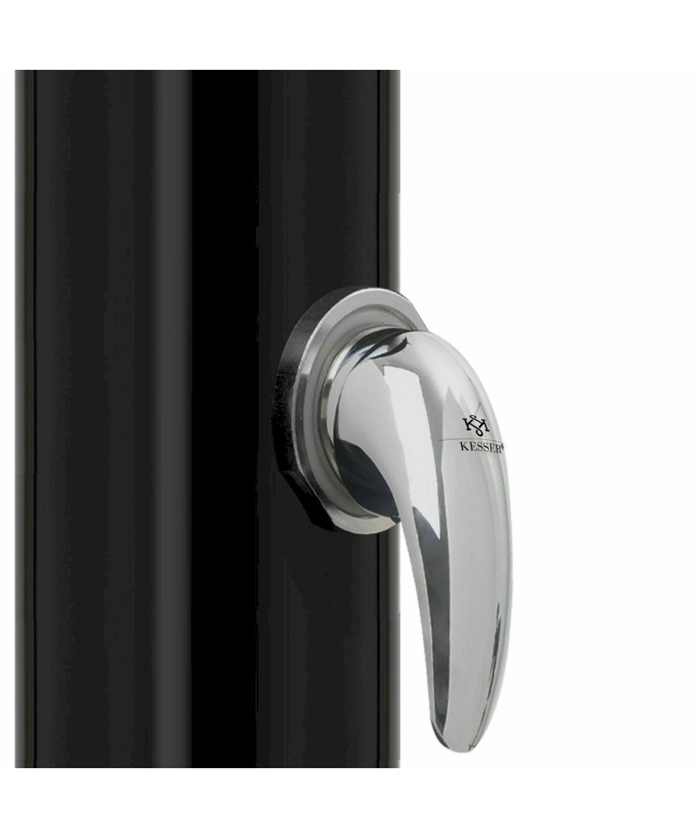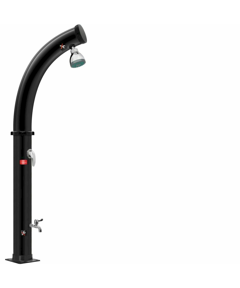 Über eine Einhebelmischbatterie aus Metall vermischt sich das warme Wasser im Tank mit dem kalten Wasser aus dem Gartenschlauch. Somit lässt sich die Wassertemperatur stufenlos nach Belieben einstellen . Der massive Fuß aus Metall sorgt für einen sicheren und stabilen Stand .