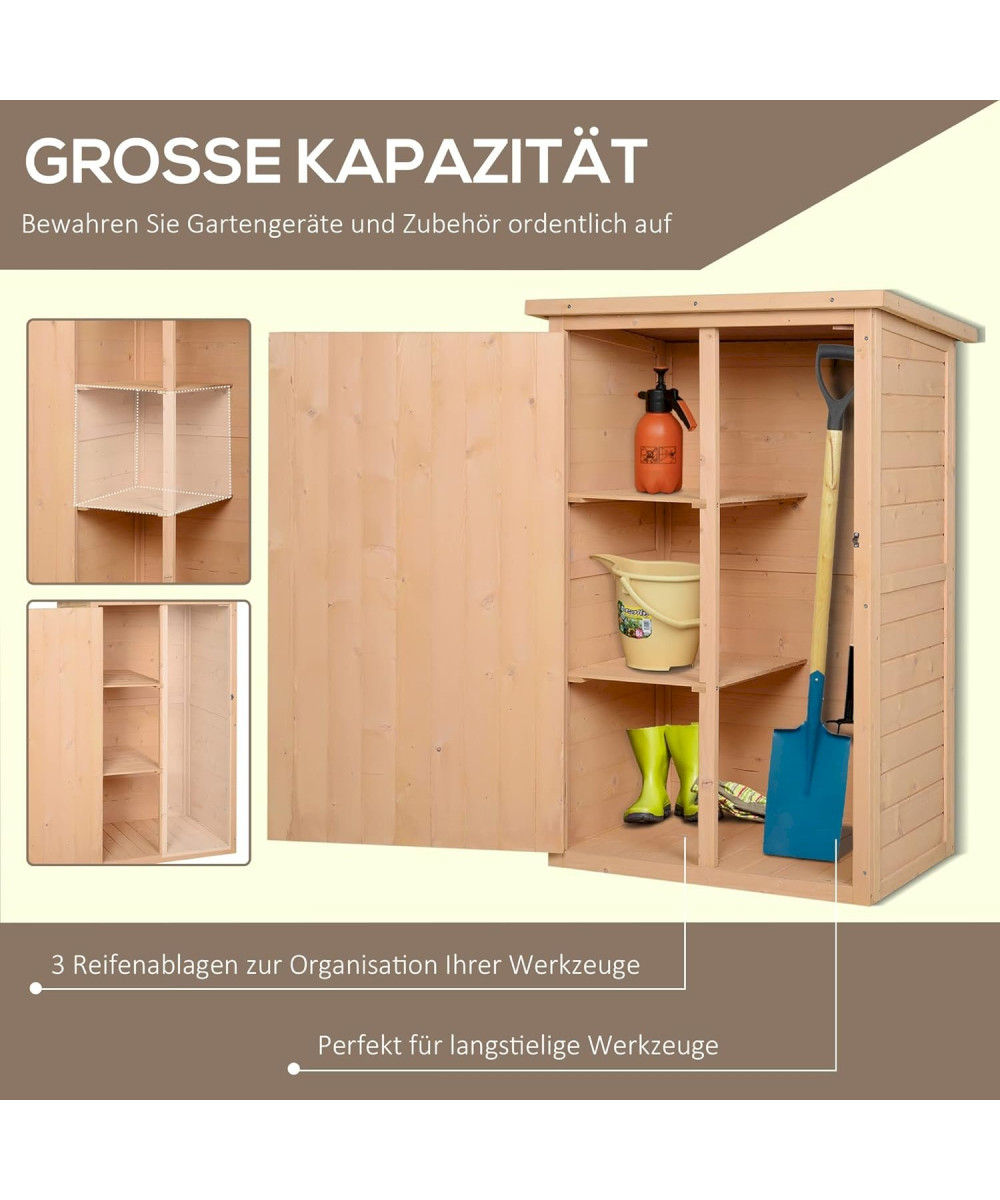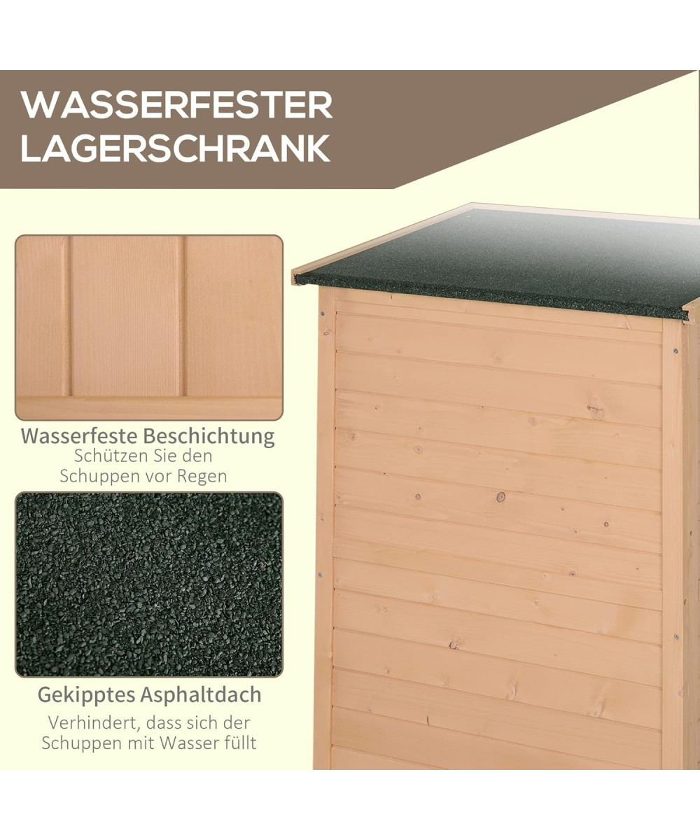 Schaffen Sie eine paradiesische Ordnung in Ihrem Garten mithilfe dieses kompakten und praktischen Geräteschuppens von Outsunny! Trotz seiner kompakten Konstruktion bietet er reichlich Raum für unterschiedlichste Geräte und Werkzeuge. Besonders robust gebaut und mit einem wetterfesten Anstrich versehen, wird Ihnen dieser Gartenschrank eine lange Zeit zuverlässig dienen. Das geneigte Dach lässt Regenwasser ungehindert abfließen und die verriegelbare Tür verhindert, dass Tiere eindringen.