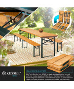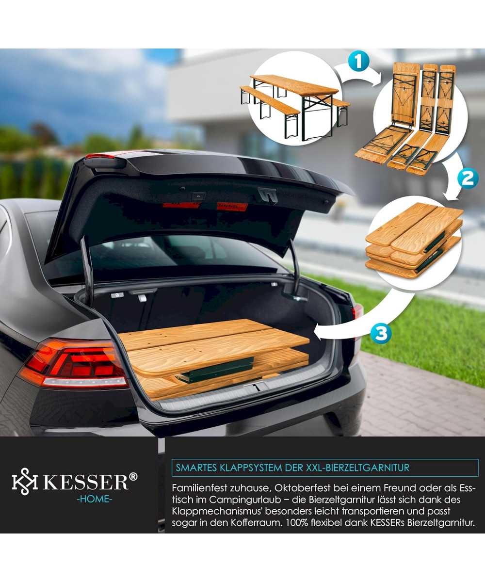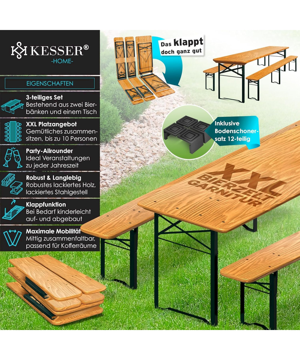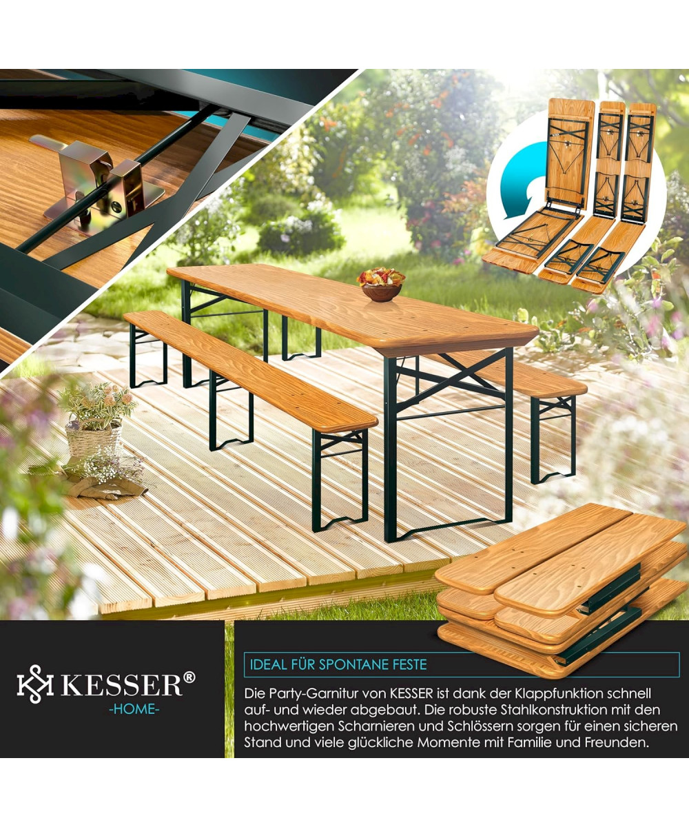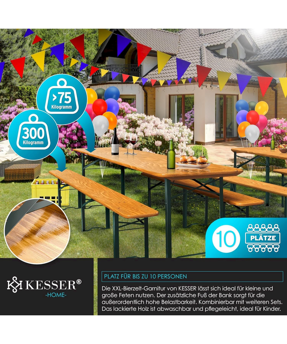 Mit KESSER wird jede Veranstaltung besser! Die KESSER Festzelt Garnitur bietet eine robuste und langlebige Sitzgruppe aus Holz und Stahl. Bestehend aus einem großen Tisch und zwei Bänken, ist dieses Set perfekt für gesellige Zusammenkünfte.