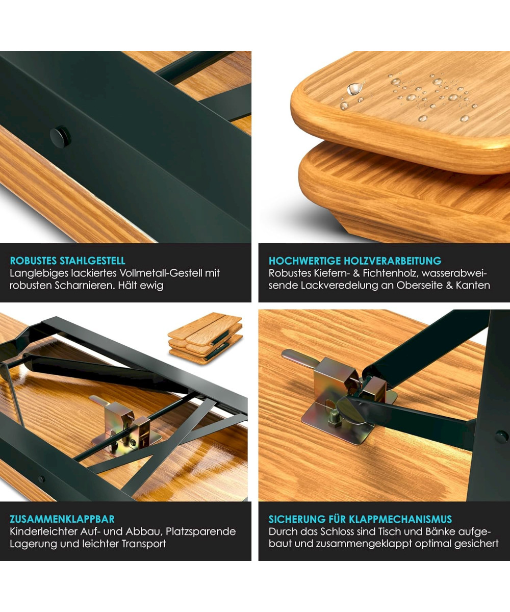 Das Bierbank-Set besteht aus Kiefer- und Fichtenholz, das mit einem klaren Holzlack lasiert ist, um vor eindringender Feuchtigkeit zu schützen. Das robuste Stahlgestell und die stabilen Scharniere sorgen für hervorragende Standfestigkeit und machen die Garnitur besonders langlebig. Die Oberseiten und Kanten des Holzes sind ebenfalls lackiert und verleihen der Garnitur eine ansprechende Optik.