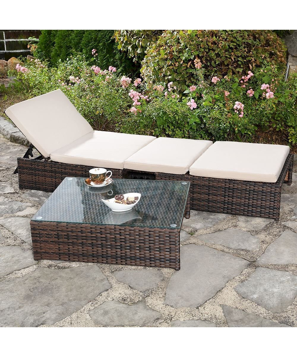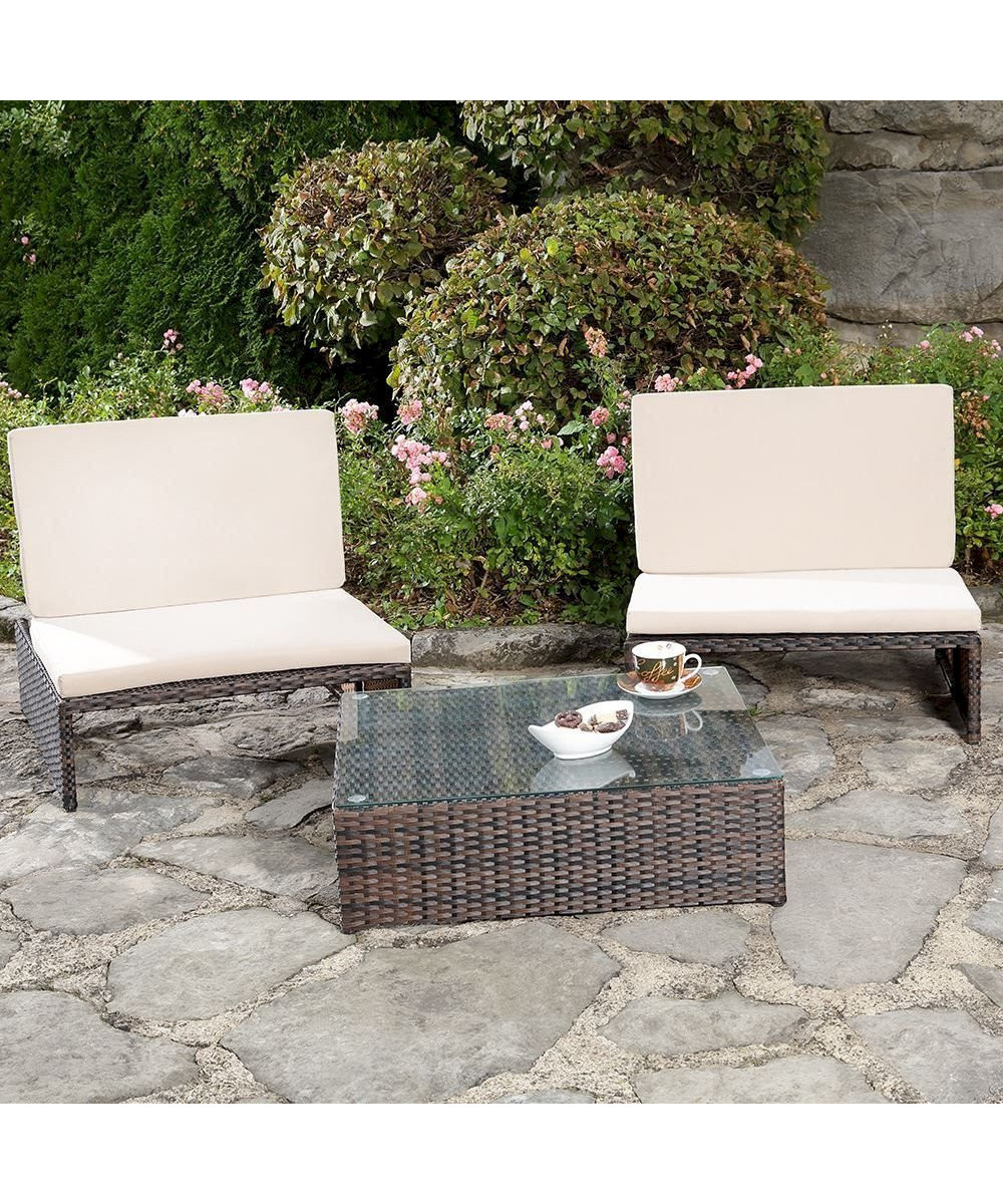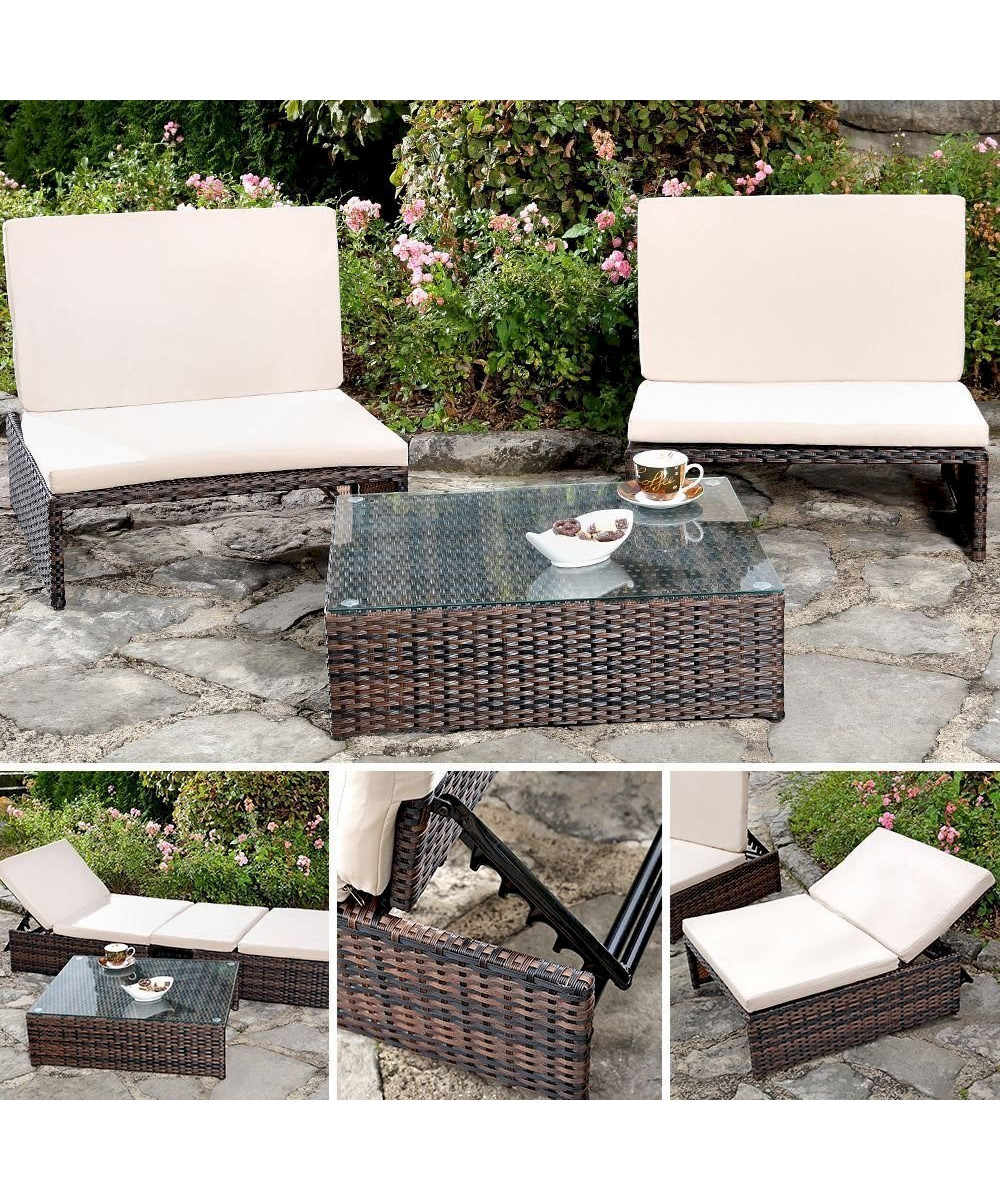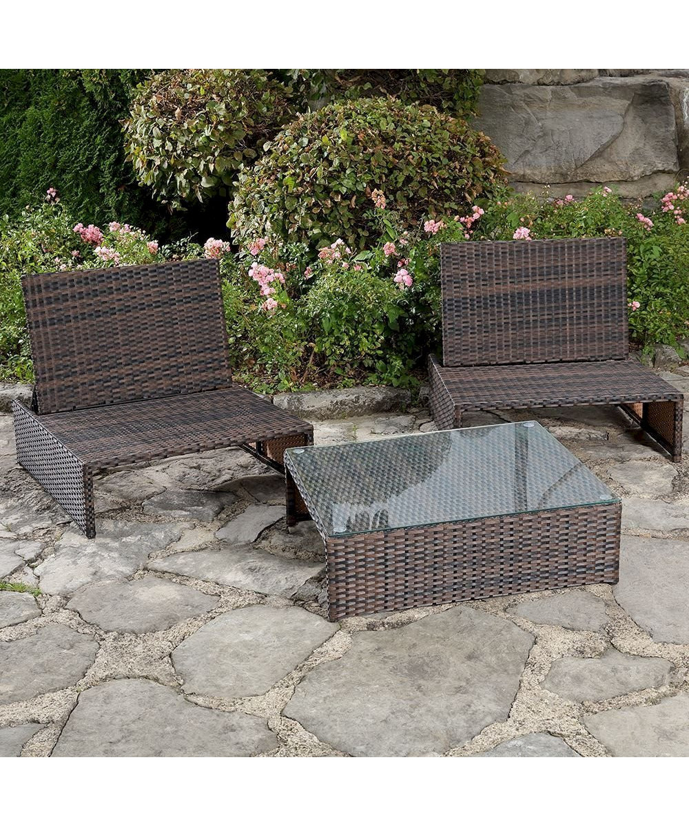 Wenn edle Vielfalt Ihr großer Wunsch ist, überzeugt Sie dieses Gartenset bestehend aus zwei Sesseln und einem Tisch. Die Möbelstücke sind aus geflochtenem Polyrattan gefertigt und erfüllen hohe Anforderungen in den Bereichen Qualität und Robustheit. Sie möchten entspannt mit Ihren Liebsten beisammen sitzen? Dann stellen Sie die beiden Sessel nebeneinander auf. Sehnen Sie sich hingegen nach einem kleinen Nickerchen, klappen Sie einfach die Lehne eines Sessels um, kombinieren die beiden Modelle und zaubern somit eine schöne Liegefläche. Für ein edles Flair im Außenbereich sorgt auch der Tisch mit Glasplatte. Dort stellen Sie Kaffeetassen, Kuchenteller und Co. ab - perfekt für einen entspannten Nachmittag im eigenen Garten. Das Gartenset wurde aus wetterfestem Polyrattan gefertigt und zeichnet sich so durch ein geringes Eigengewicht aus. Ein Metallgestell sorgt für Stabilität.