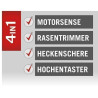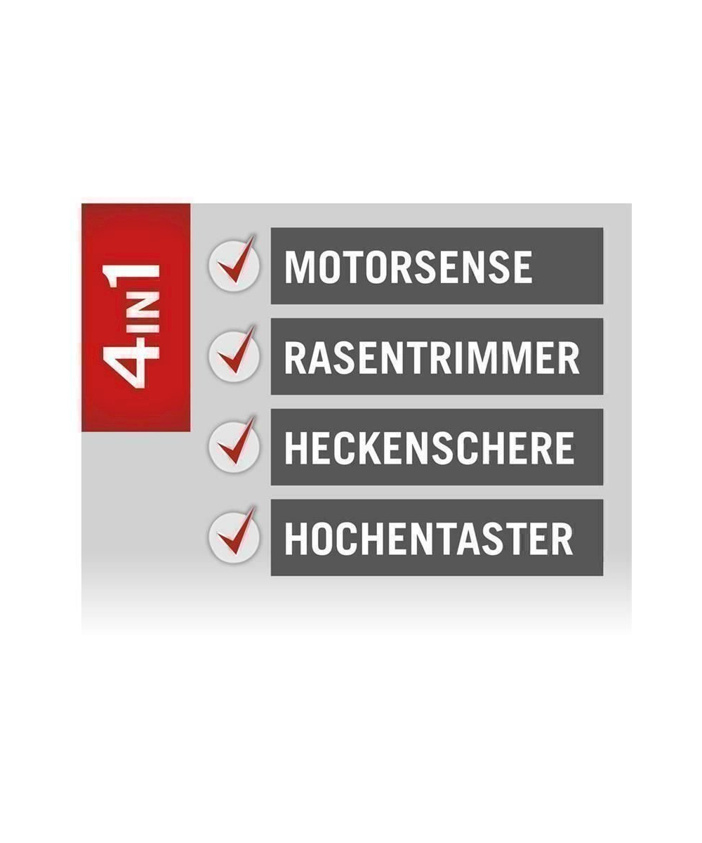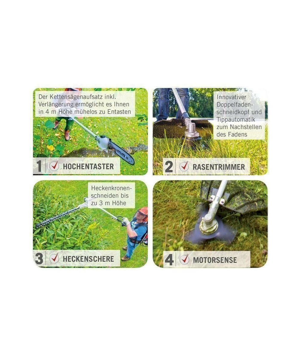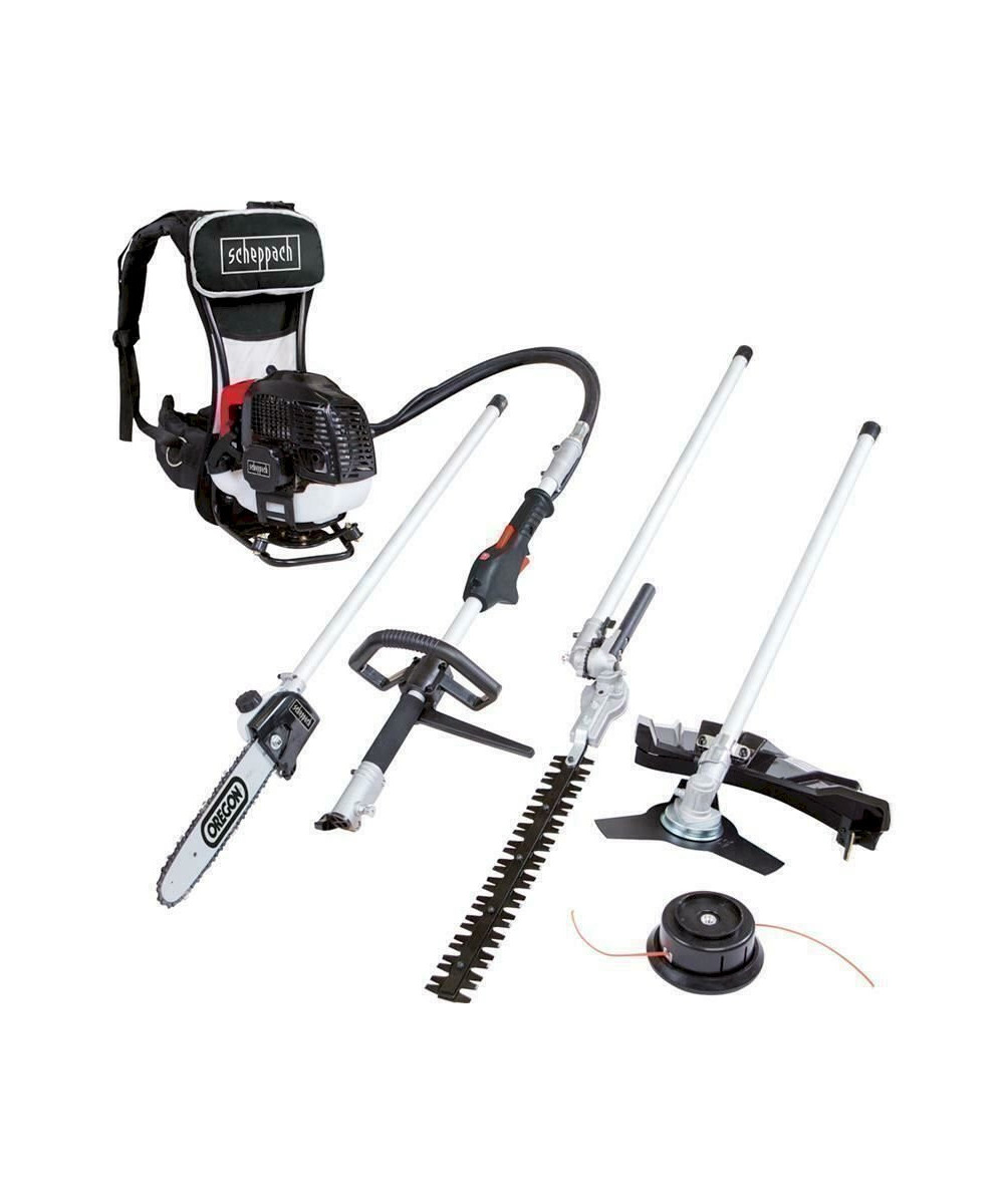 Das 4in1 Gartengerät von Scheppach vereint gleich 4 Funktionen einem praktischen Gerät. Der 1,8 PS starke Motor befindet sich dabei komfortabel und ausgewogen mit einer Tragevorrichtung auf Ihrem Rücken. Dies sorgt für eine hervorragende Ergonomie zugleich für ein ermüdungsfreies Arbeiten. Mit den vier verschiedenen Aufsätzen können Sie mühelos Ästen zurück schneiden, Rasenflächen trimmen, Hecken kürzen sowie Auswuchs zurück schneiden.