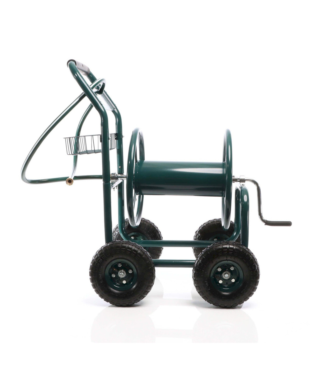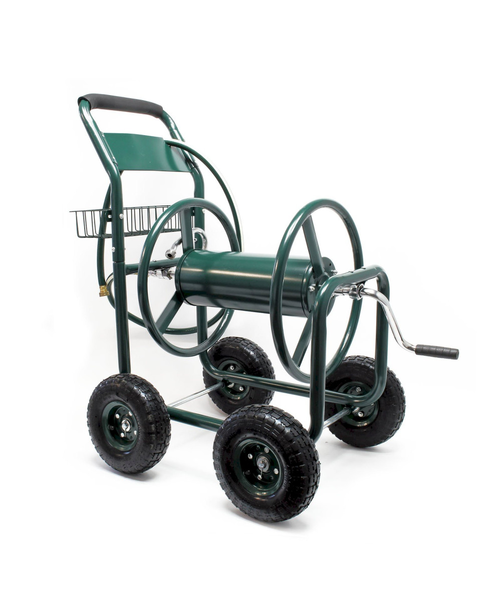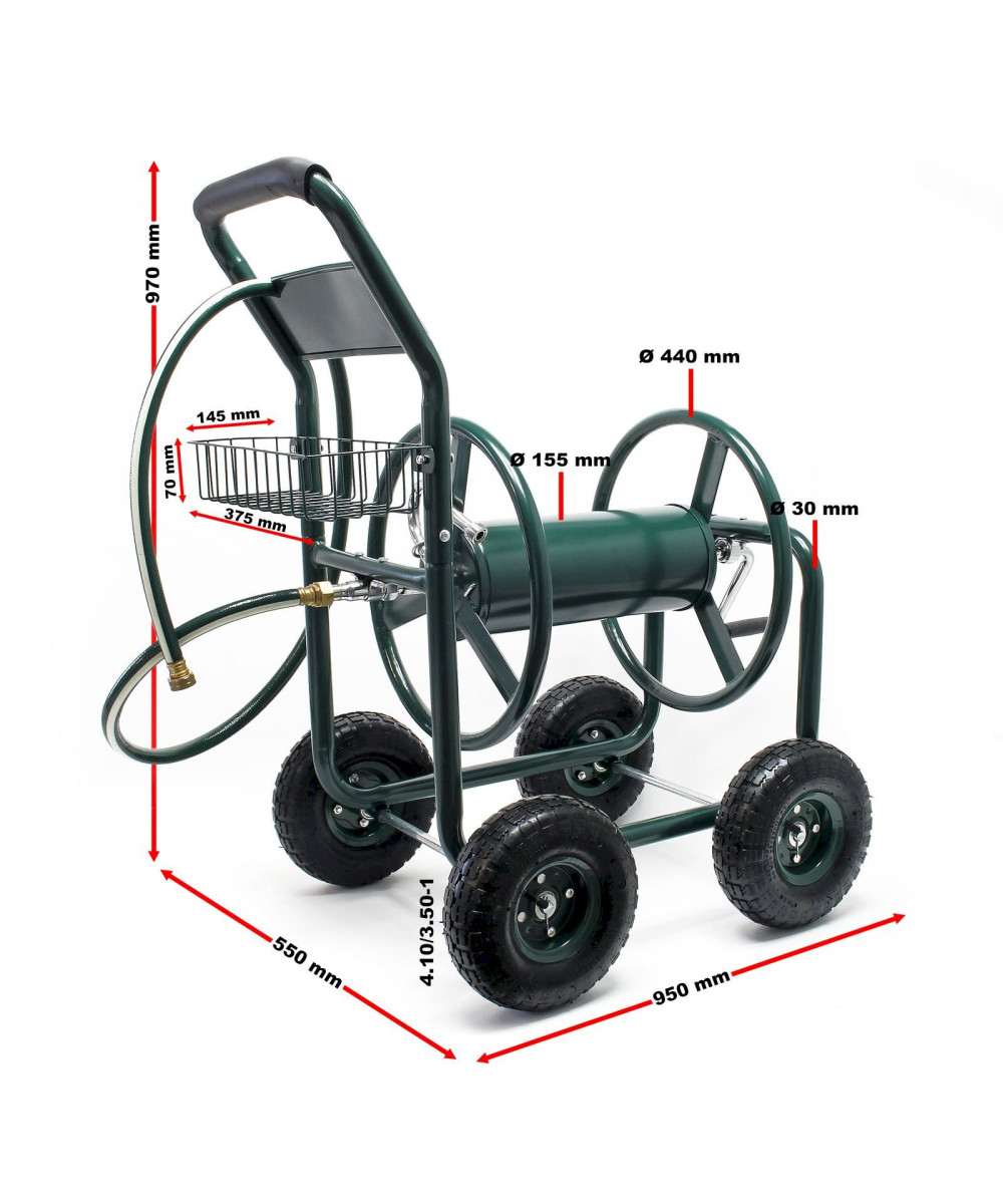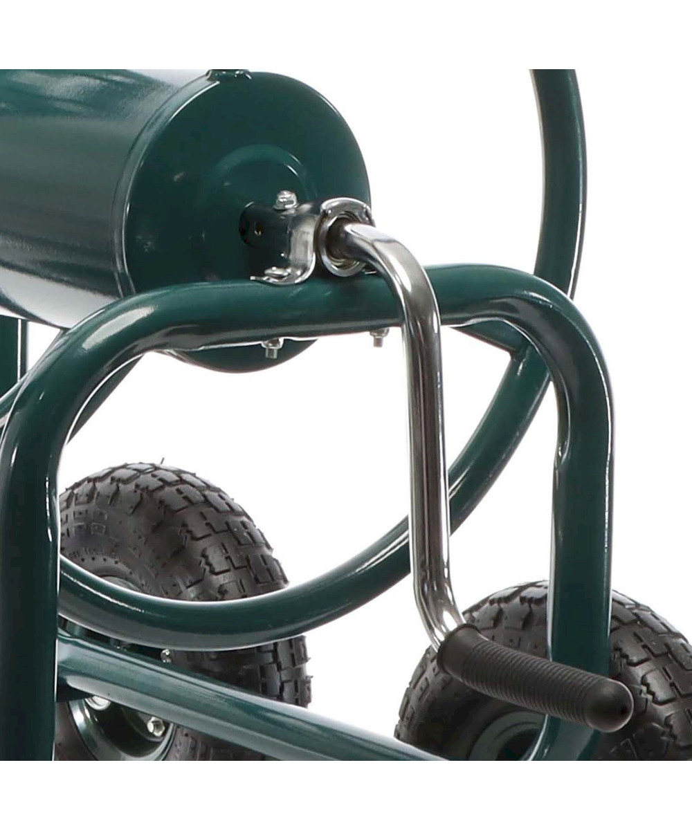 Dank der ca. 25 cm großen Luftreifen lässt sich der Wagen über alle unebenen Untergründe rollen und dank seiner Schnellkupplung kann jeder Gartenschlauch problemlos angeschlossen werden und mit der praktischen Handkurbel können sie den Schlauch ablassen und aufrollen.