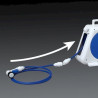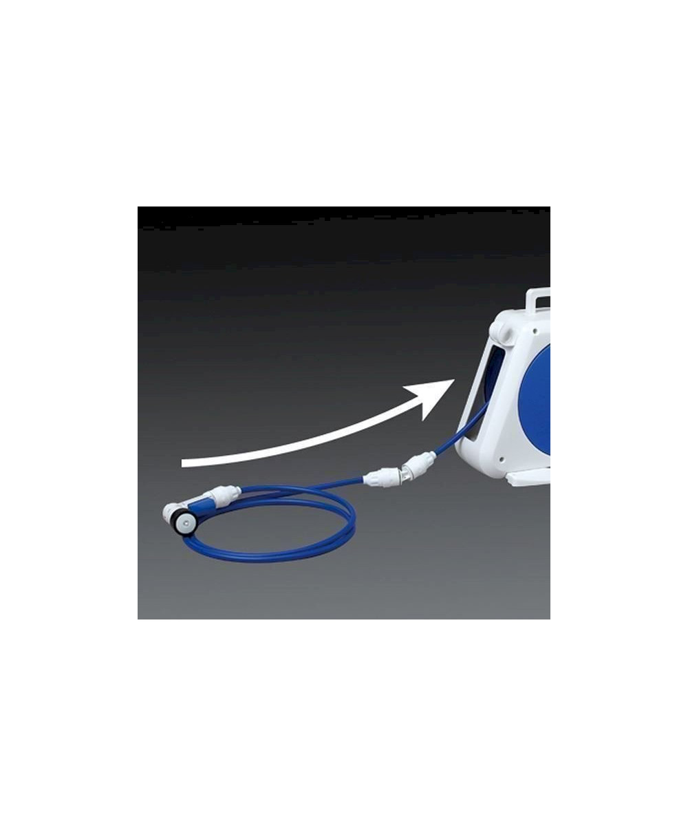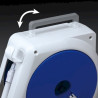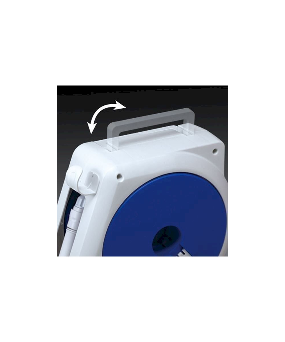 Diese leichte Schlauchtrommel (15 m + 1,5 m Anschlussschlauch) verfügt über eine integrierte 'Kompakt-Brause' und einen ausziehbaren Fuß mit Lochbohrung für die Wandaufhängung.