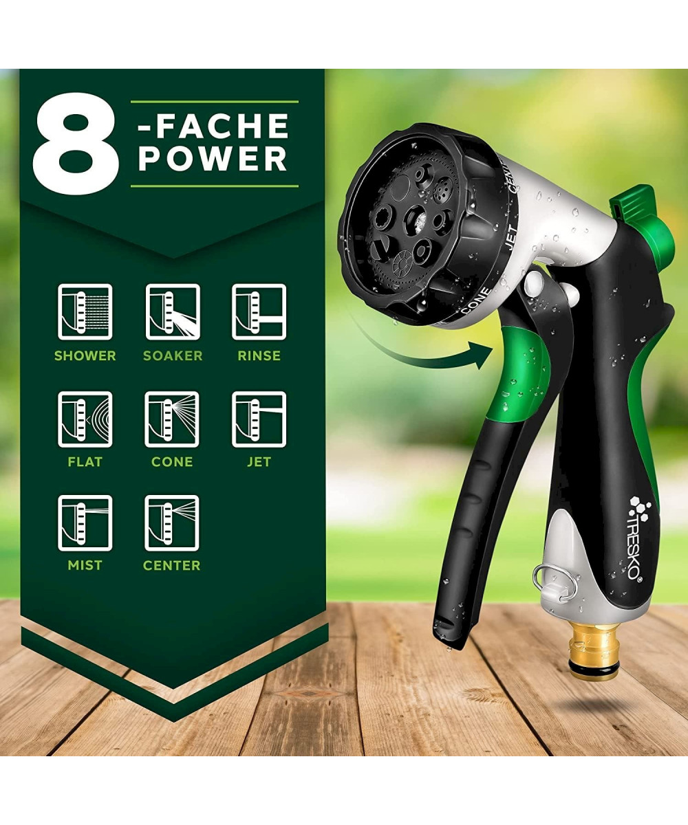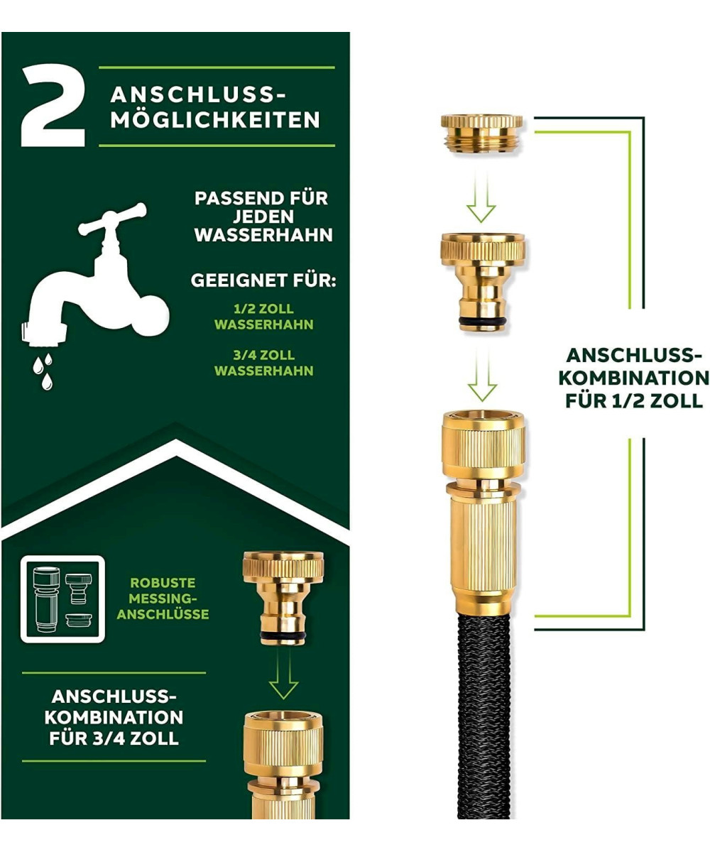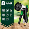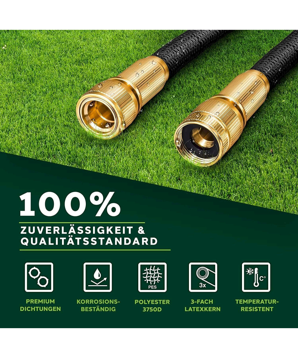 Hochflexibler, sich ausdehnender Premium-Gartenschlauch in Profi-Qualität mit nichtrostenden Messing-Verschraubungen und 3-fach Latexkern . Der Multifunktions-Sprühkopf mit 10 Funktionen (8 Sprüheinstellungen, Druckregulierung min/max, Feststellfunktion für Sprühtaster) verfügt über einen ergonomisch optimierten Handgriff und wurde für perfekten Halt mit Gummi überzogen. Der Wasserdruck lässt sich über einen Schieberegler direkt an der Pistole regulieren und deshalb auch zum Bewässern sensibler Pflanzen einsetzen.