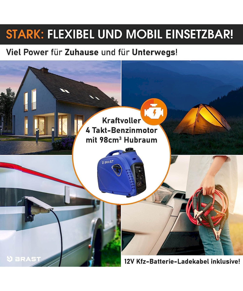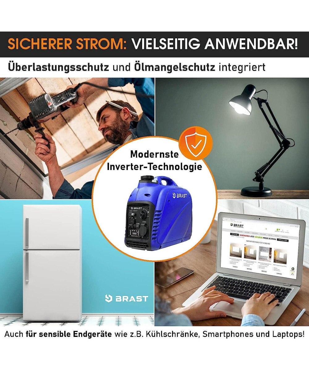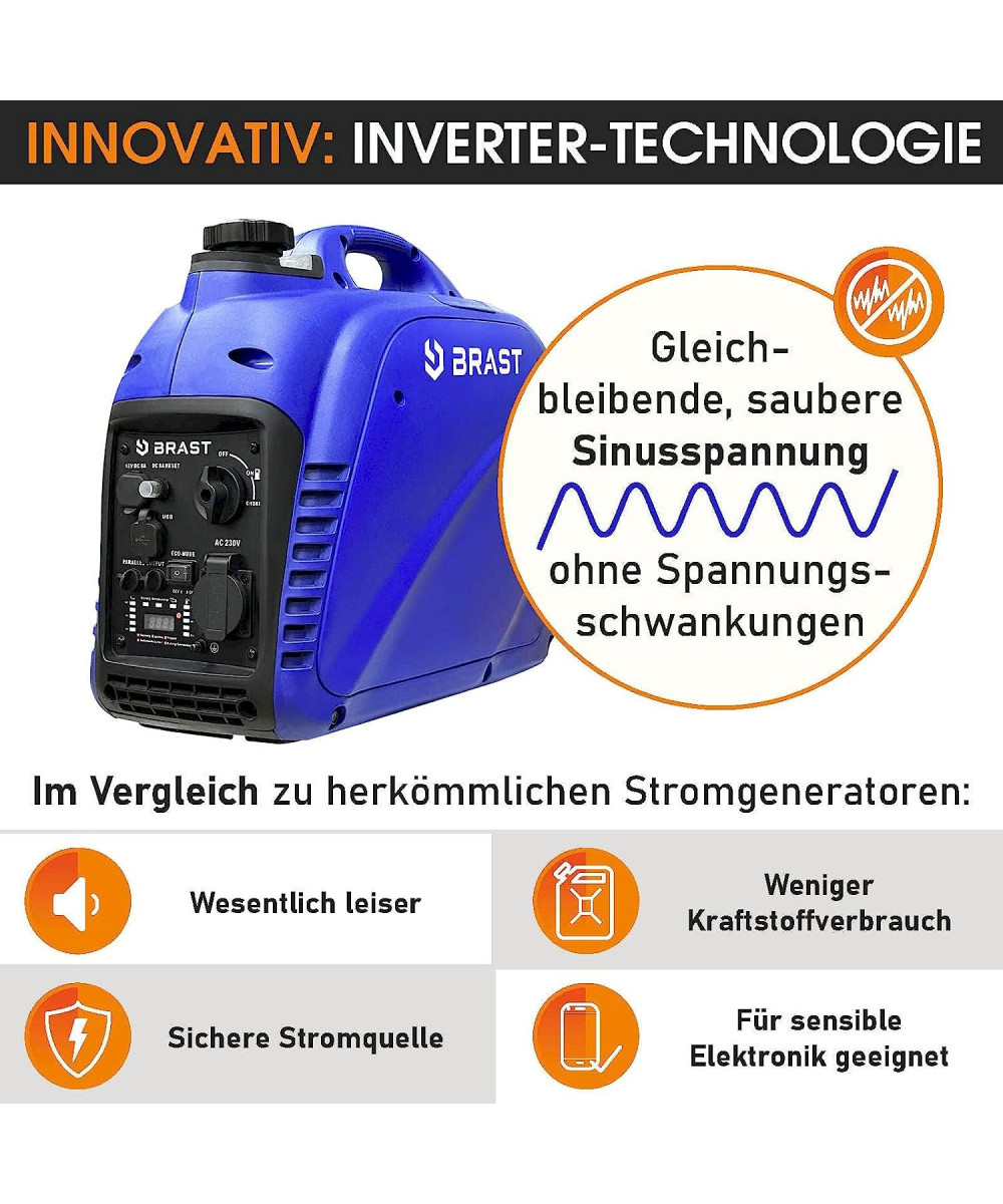 Unser BRAST Stromgenerator liefert durch neueste Inverter-Technologie besonders hochwertigen Strom auch für empfindliche Geräte: