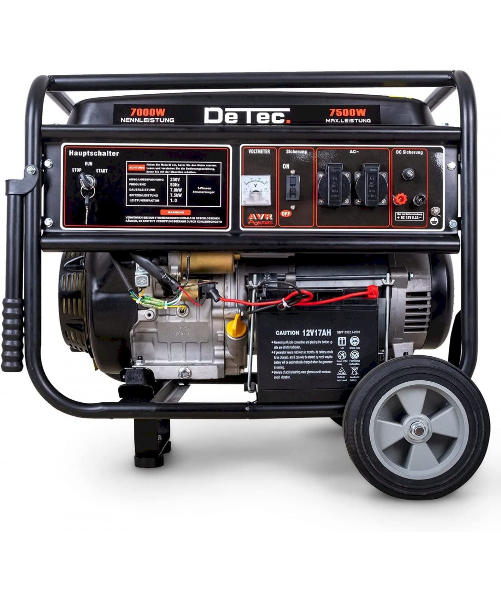 Der DeTec. Stromerzeuger DT-LB7500E-1 hat einiges zu bieten: Satte 7 kW Dauerleistung und kurzzeitig bis zu 7,5 kW Spitzenleistung decken Ihren Bedarf. Die mitgelieferte Starterbatterie ermöglicht den bequemen Start per Zündschlüssel . Die Batterie wird während des Betriebs geladen und hat so immer die benötigte Spannung für den Start. Sollte die Spannung einmal nicht ausreichen ist es möglich den Stromerzeuger mit dem Seilzugstarter zu starten. Das Voltmeter zeigt die ausgegebene Spannung an. Dank der großen Räder und der Griffe lässt sich der Stromerzeuger leicht an seinen Einsatzort bringen und stellt Ihnen dort zwei 230 V Schukosteckdosen zur Verfügung. Dank des großen 25 L Benzin-Tanks steht langen Arbeitseinsätzen nichts im Weg.