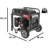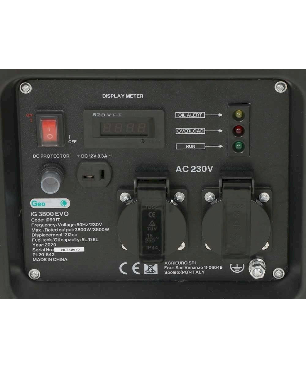 Der Stromgenerator Geotech iG 3800 EVO ist eine sehr praktische und einfach zu bedienende Maschine. Er lässt sich tatsächlich auch leicht transportieren dank seiner beiden Räder und der einklappbaren Griffe. Der Generator kann eine maximale Leistung von 3,8 kW abgeben. Außerdem hat er einen 4-Takt Benzinmotor EURO V zu 212 cc , der eine Nennleistung von 7,5 PS erbringen kann.