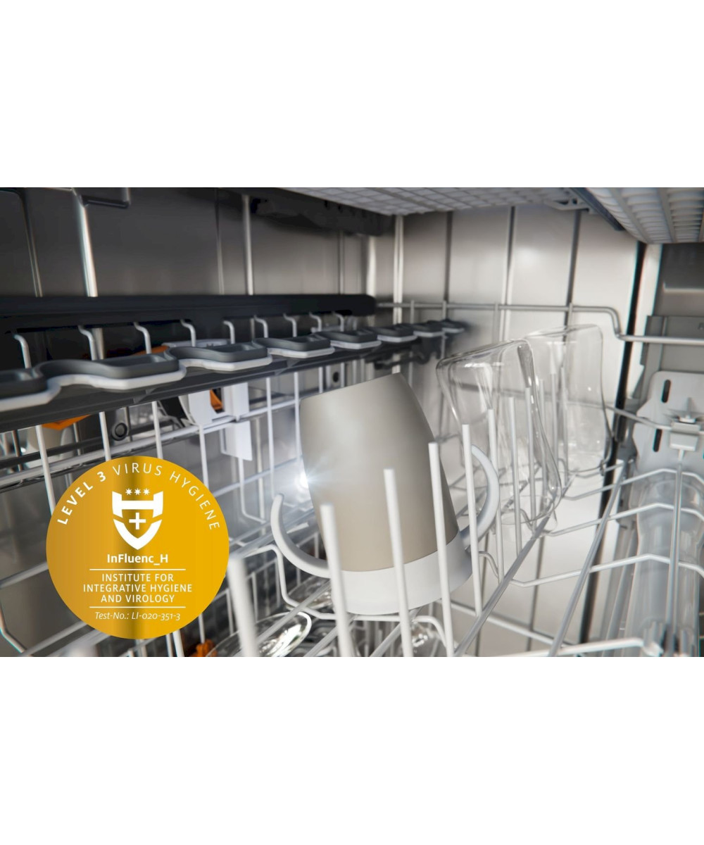 Sorgloses Geschirrspülen: Dank des Hygiene- bzw. Intensiv-Programms in Kombination mit der PowerDisk bzw. den UltraTabs werden mehr als 99,9% der Viren (z.B. Corona-, Influenza oder Noroviren) zuverlässig entfernt. Das hat eine Prüfung des Institute for Hygiene and Virology bestätigt. Auch die Hochschule Rhein-Waal belegt die die außerordentliche hygienische Reinigungsleistung von Miele Geschirrspülern. Im Hygienetest werden mit AutoDos und PowerDisk im Programm ECO und QuickPowerWash 65 °C mehr als 99,99% der Bakterien (Enterococcus faecium) entfernt. Und das Hygieneprogramm reduziert im Test selbst ohne Reiniger die Bakterienlast (Enterococcus faecium oder Micrococcus luteus) um mindestens den Faktor 10.000.