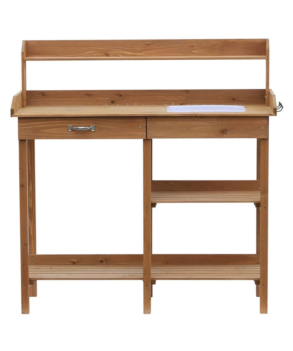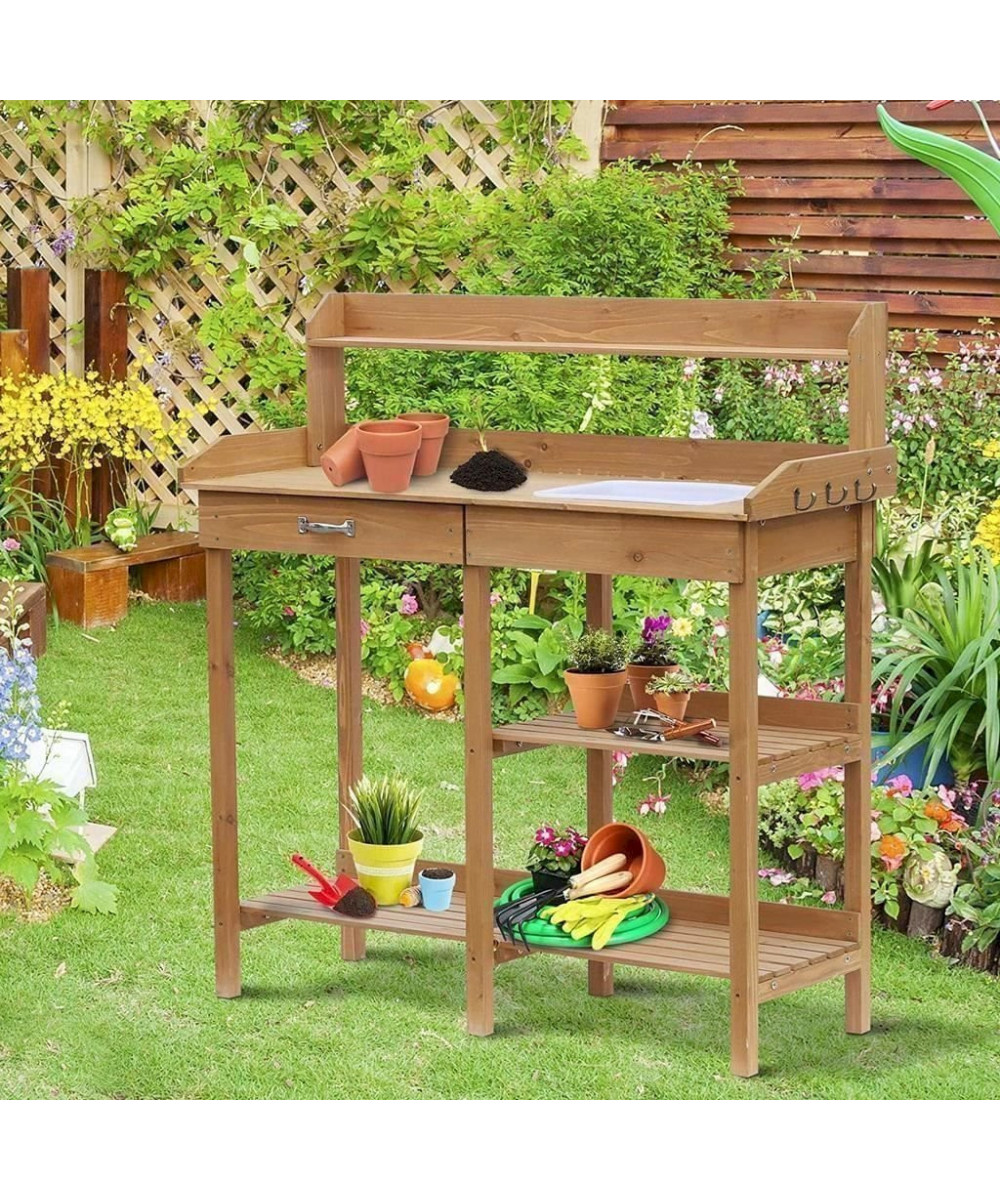 Bei der Suche nach einer Arbeitsfläche zum Bepflanzen, Umtopfen oder für weitere Gartenarbeiten werden Sie bei unserem Pflanztisch fündig. Der funktionelle Gartentisch bietet durch seine Einlegeböden ausreichend Stellplatz für Ihre Pflanzen. Ihre Werkzeuge sowie Pflanzzubehör finden in der Schublade sicher Platz. Gartenschere, Blumenkelle und Gartenhandschuhe lassen sich an den drei seitlichen Haken griffbereit platzieren. Die Arbeitsfläche ist zudem mit einer praktischen Wanne für Gartenerde- und Abfälle ausgestattet. Dank einer angenehmen Arbeitshöhe von 89,2cm arbeiten Sie sehr komfortabel. So macht Gartenarbeit noch mehr Freude.