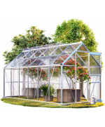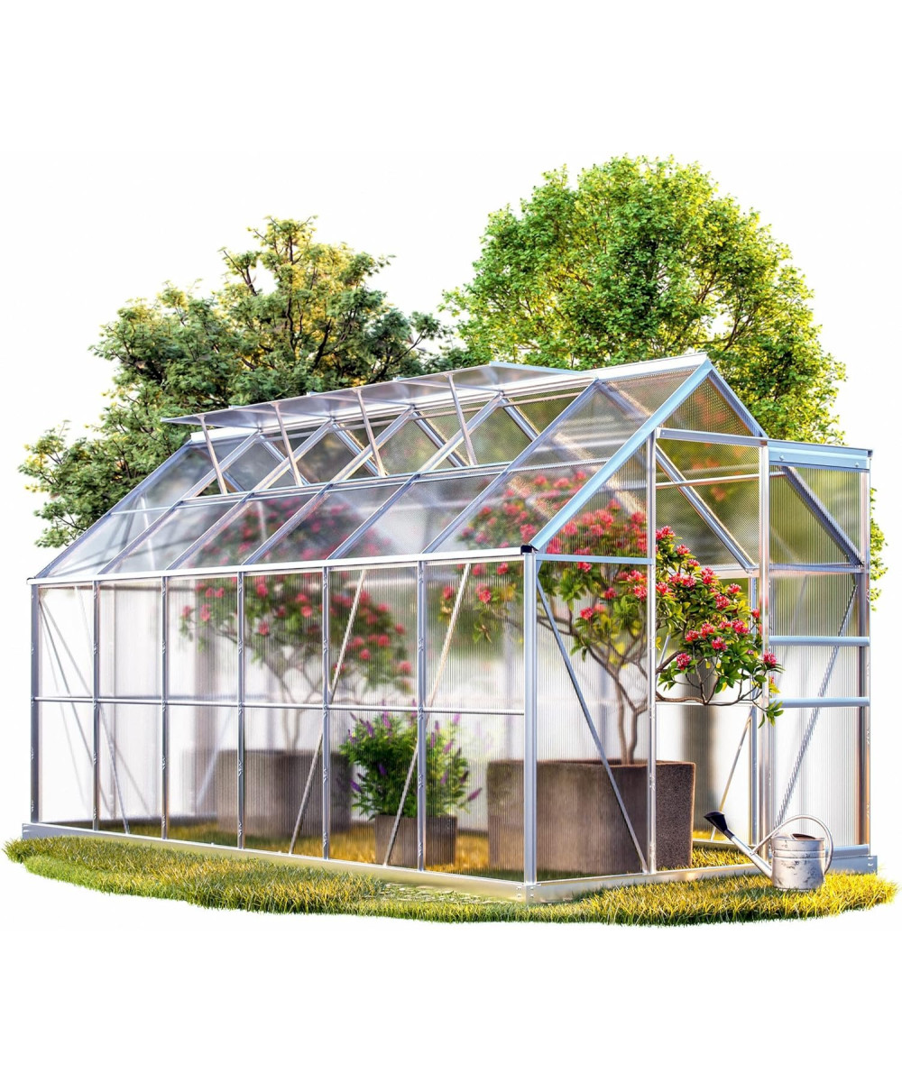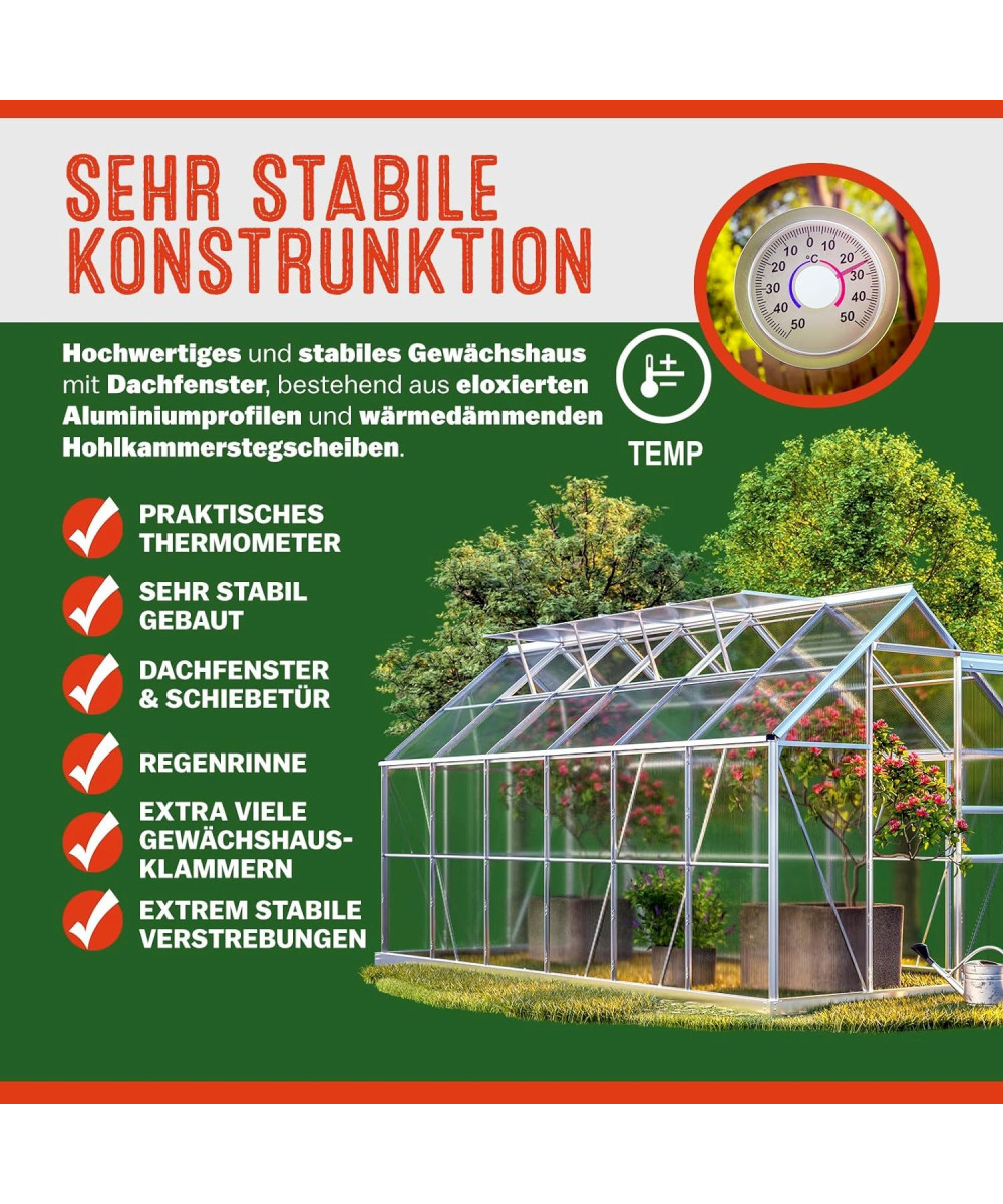 Hochwertiges und stabiles Gewächshaus aus eloxierten Aluminiumprofilen und wärmedämmenden Hohlkammerstegscheiben.