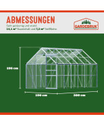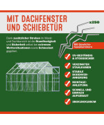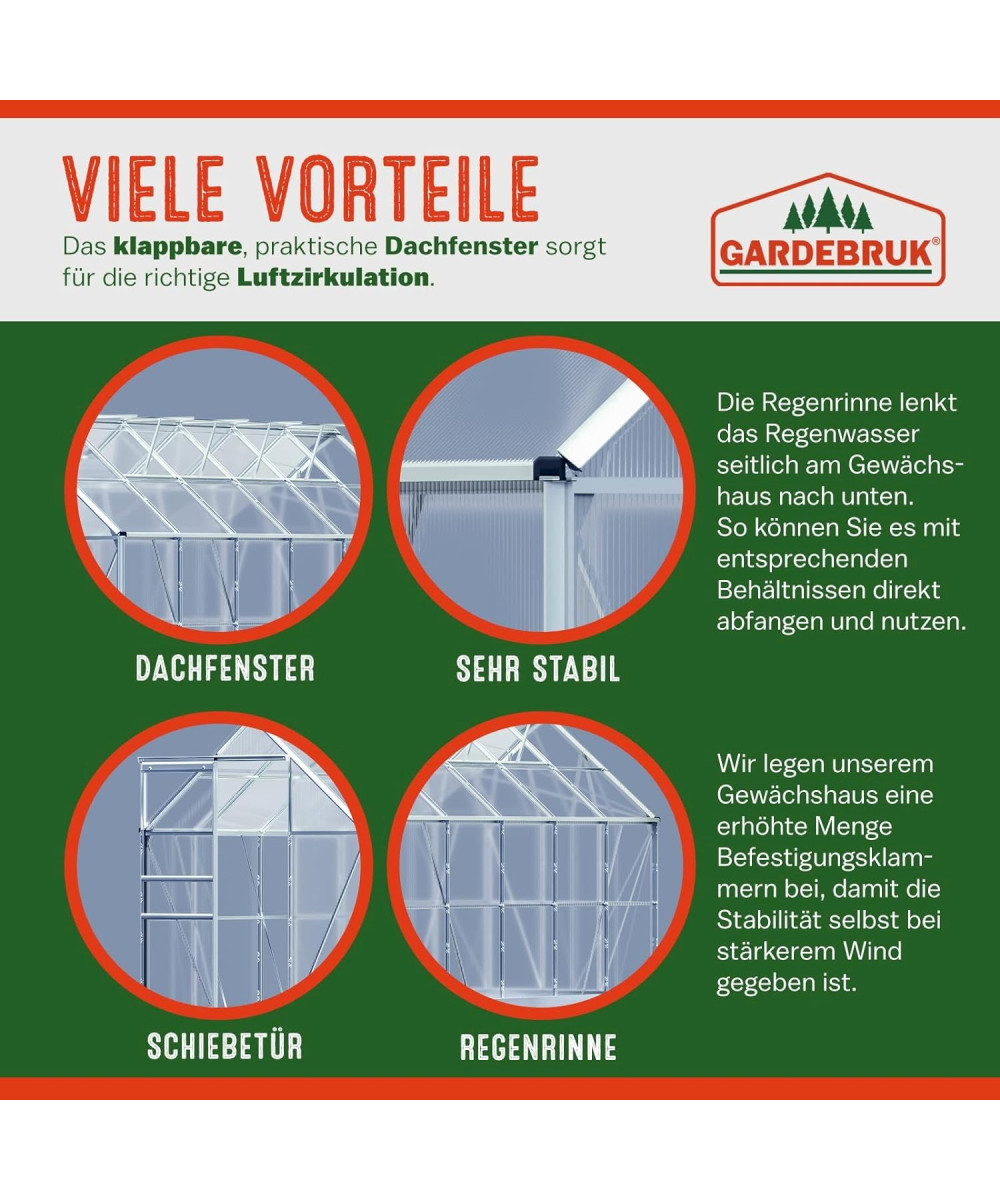Das Gewächshaus verfügt über 4 Lüftungsfenster zur optimalen Luftzirkulation und 2 Regenrinnen. Die Regenrinne lenkt den Regenfluss seitlich am Gewächshaus nach unten. So können Sie das Regenwasser mit entsprechenden Behältnissen direkt abfangen und nutzen.