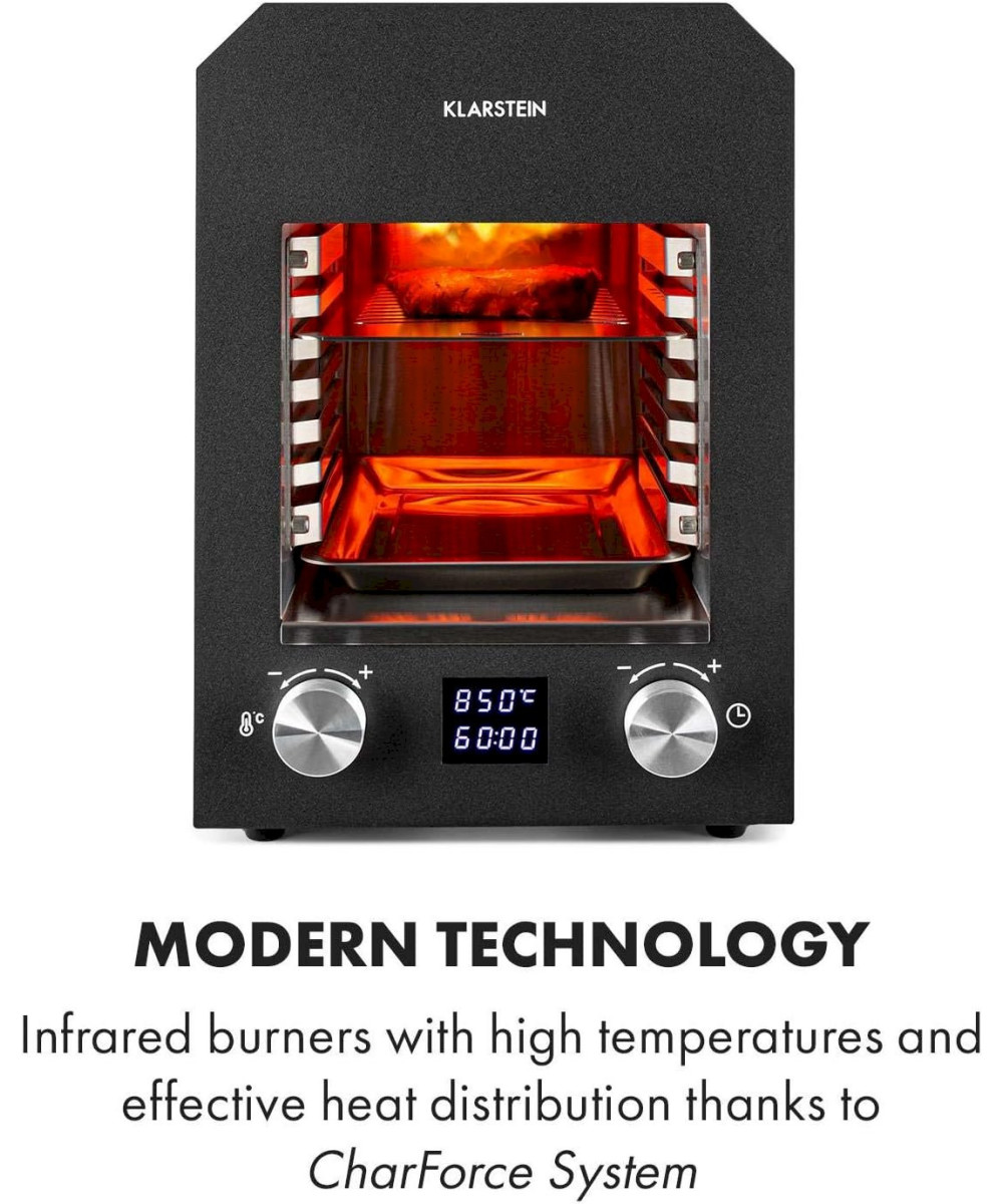 Das Infrarot-Heizelement des Klarstein Hannibal Hochtemperaturgrills gibt mit einer Heizleistung von 2.200 Watt eine besonders intensive Strahlungswärme an die darunterliegenden Speisen ab. Auf dem Grillrost aus Edelstahl können vor allem Steaks hervorragend auf den Punkt gegrillt werden: Durch das integrierte CharForce System mit hohen Temperaturen bis zu 850 °C und unterschiedlichen Einschubhöhen gelingt das Fleisch außen schön kross und innen zart - beste Bedingungen für einzigartige Gourmeterlebnisse!