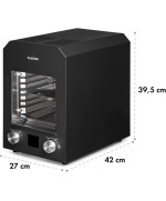 Der zweite Drehregler dient zur Einstellung des Timers, der als Stoppuhr bis maximal 60 Minuten zum Einsatz kommt und die Zubereitung vielzähliger Sorten Fleisch, von Fisch, Gemüse, Brot, Aufläufen und sogar Desserts vereinfacht. Dank seiner intuitiven Handhabung, der unkomplizierten Reinigung und seiner vielseitigen Einsatzmöglichkeiten garantiert der Hannibal jederzeit vorzügliche Ergebnisse.