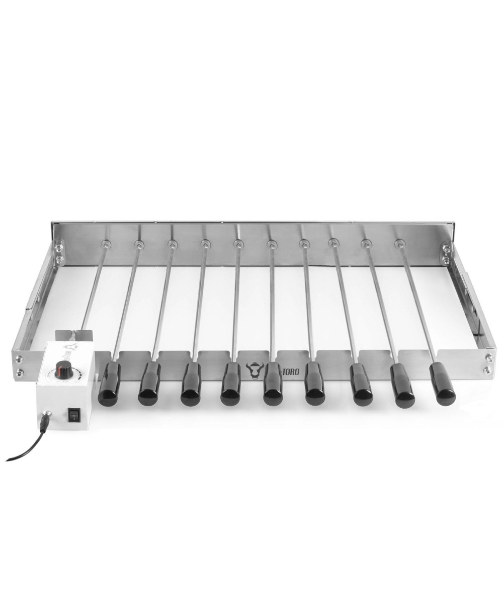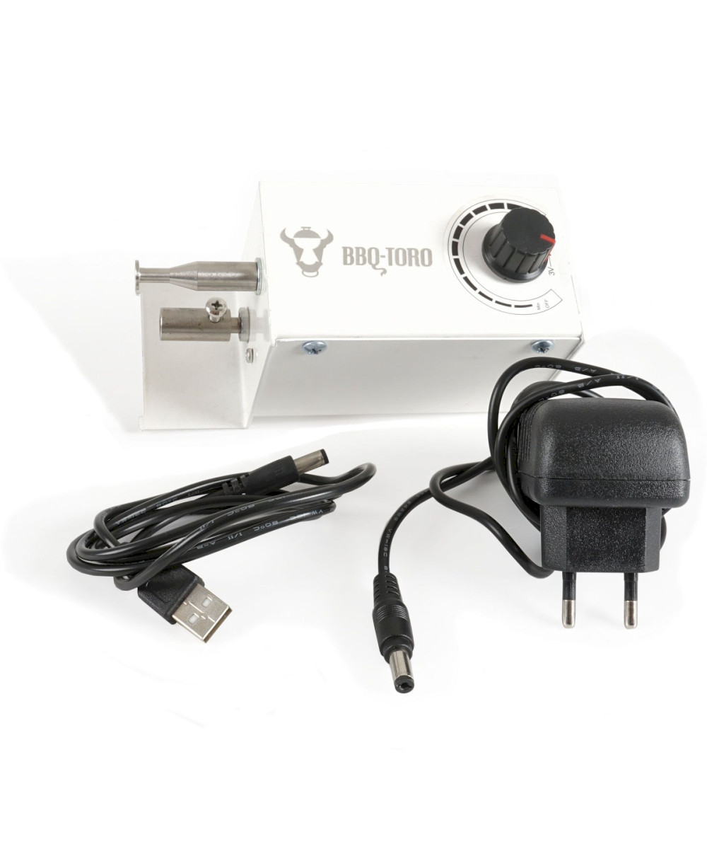 Mit dem elektrischen BBQ-Toro Spießdreher können Sie bequem und ohne großen Aufwand leckere Grillspieße herstellen. Durch den elektrischen Antrieb werden alle Spieße gleichmäßig gedreht und das Grillgut bleibt saftig und zart. Die Drehgeschwindigkeit kann am Motor stufenlos eingestellt werden.