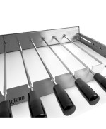 Auf den 10 Spießen ist ausreichend Platz für verschiedenste Zutaten. Die stabilen Spießstangen mit Griff werden nach dem Bestücken einfach in das Rotisseriegestell eingelegt und der Motor erledigt die Zubereitung. Mit dem beiliegenden USB Anschluß ist der elektrische Spießdreher überall mobil einsetzbar.