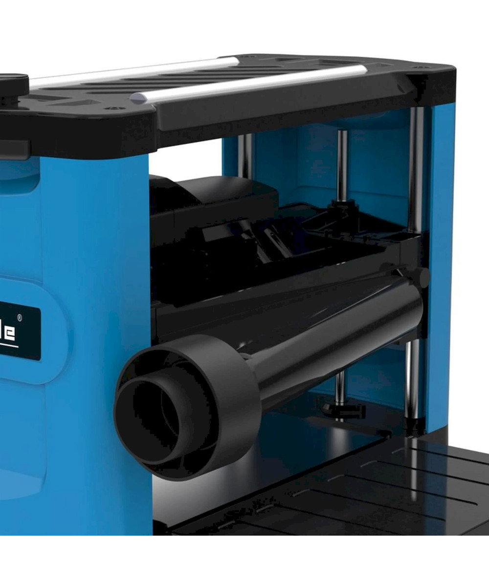 Dickenhobel für den Einsatz in der Werkstatt oder auf der Baustelle, bringt Latten, Balken und Bretter auf exaktes Maß, beidseitiger großer aufklappbarer Auflagetisch aus Stahlblech, stufenlose Höhenverstellung mit Handkurbel, robuste 4-Wellenführung, Nullspannungsschalter, Schnitttiefe und Skalenanzeige für saubere Schnitte, integrierte Griffe für leichten Transport