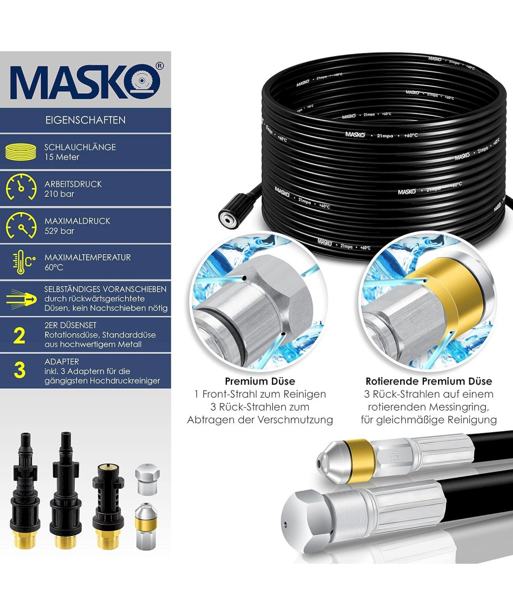 Außerdemverfügt unser Premium-Rohrreinigungssetüber eine Löse- und Abtriebsdüsesowie eine rotierende Düsefür eine gleichmäßige Säuberung. Dank seiner 3 Adapter mit einer hochwertigen Messing-Verschraubungist der Rohrreinigungsschlauchmit fast allen gängigen Hochdruckreinigern kompatibel.