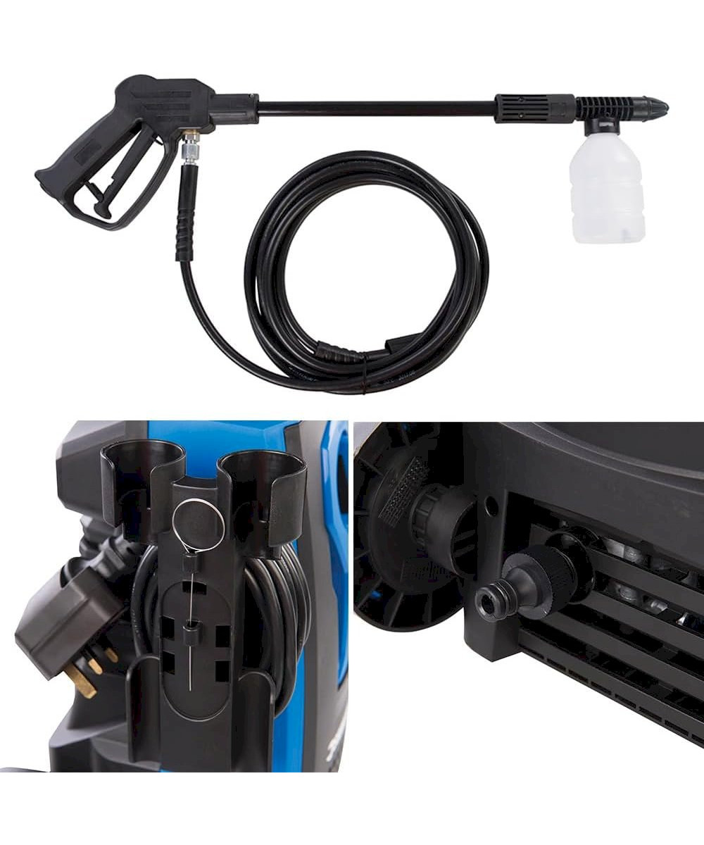 Integrierte Sprühlanzenhalterung und Netzkabelhaken, 5 m langer Hochdruckschlauch und 5 m langes Netzkabel.