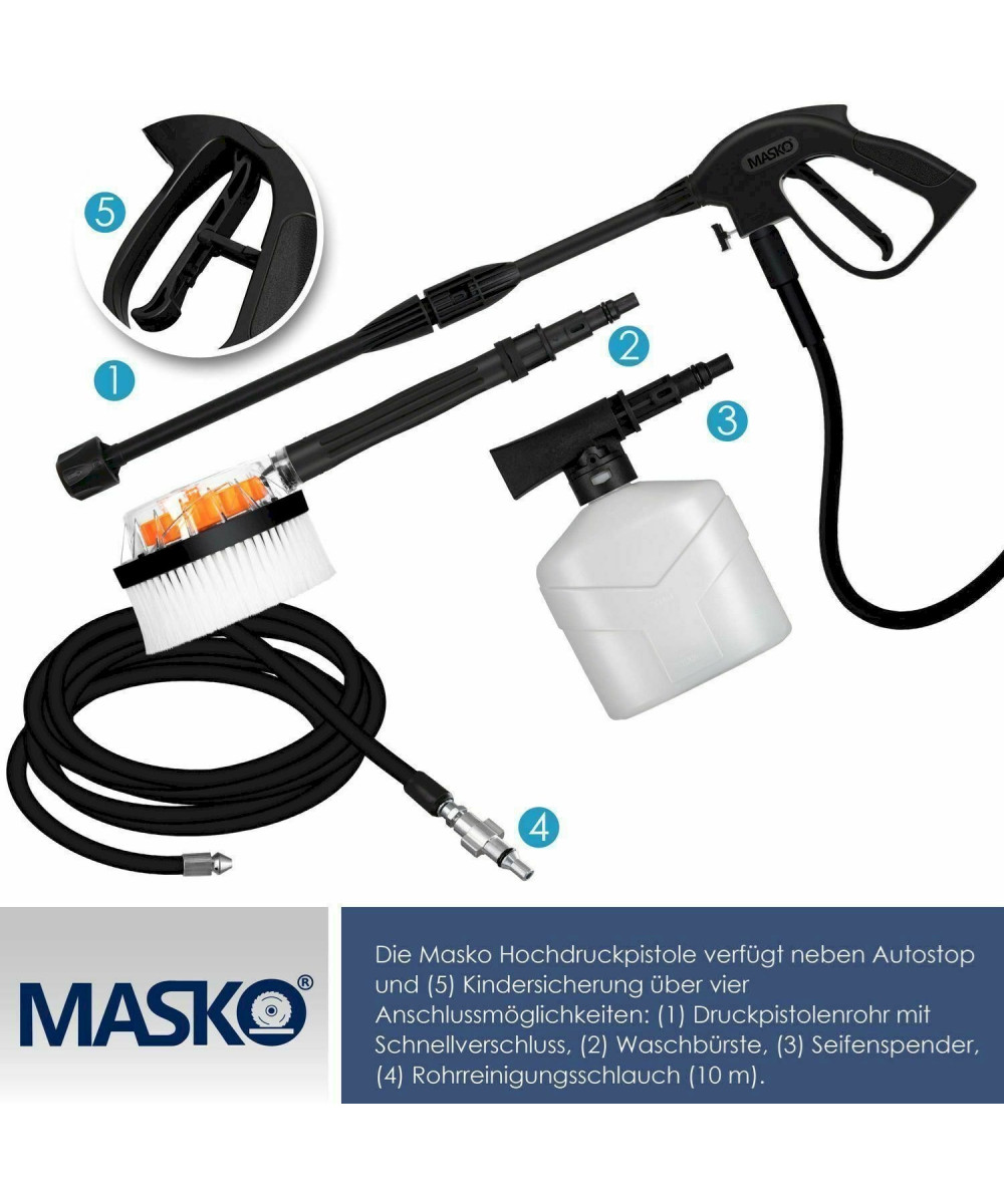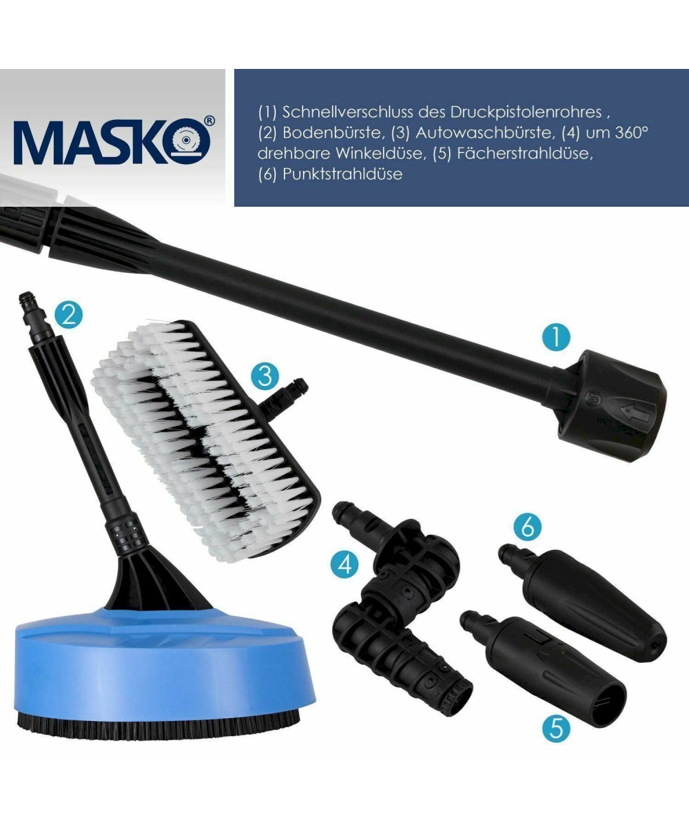 Durch die verschiedenen Anschlussmöglichkeiten ist der MASKO Hochdruckreiniger für viele unterschiedliche Einsatzgebiete eine ausgezeichnete Wahl. Durch den Schnellverschluss des Druckpistolenrohres wird ein schnelles und einfaches Wechseln der Anschlüsse ermöglicht. Für Tätigkeitsfelder wie zum Beispiel Terrassen- und Balkonflächen eignet sich hervorragend die Bodenbürste , um ein sauberes Ergebnis zu erzielen.