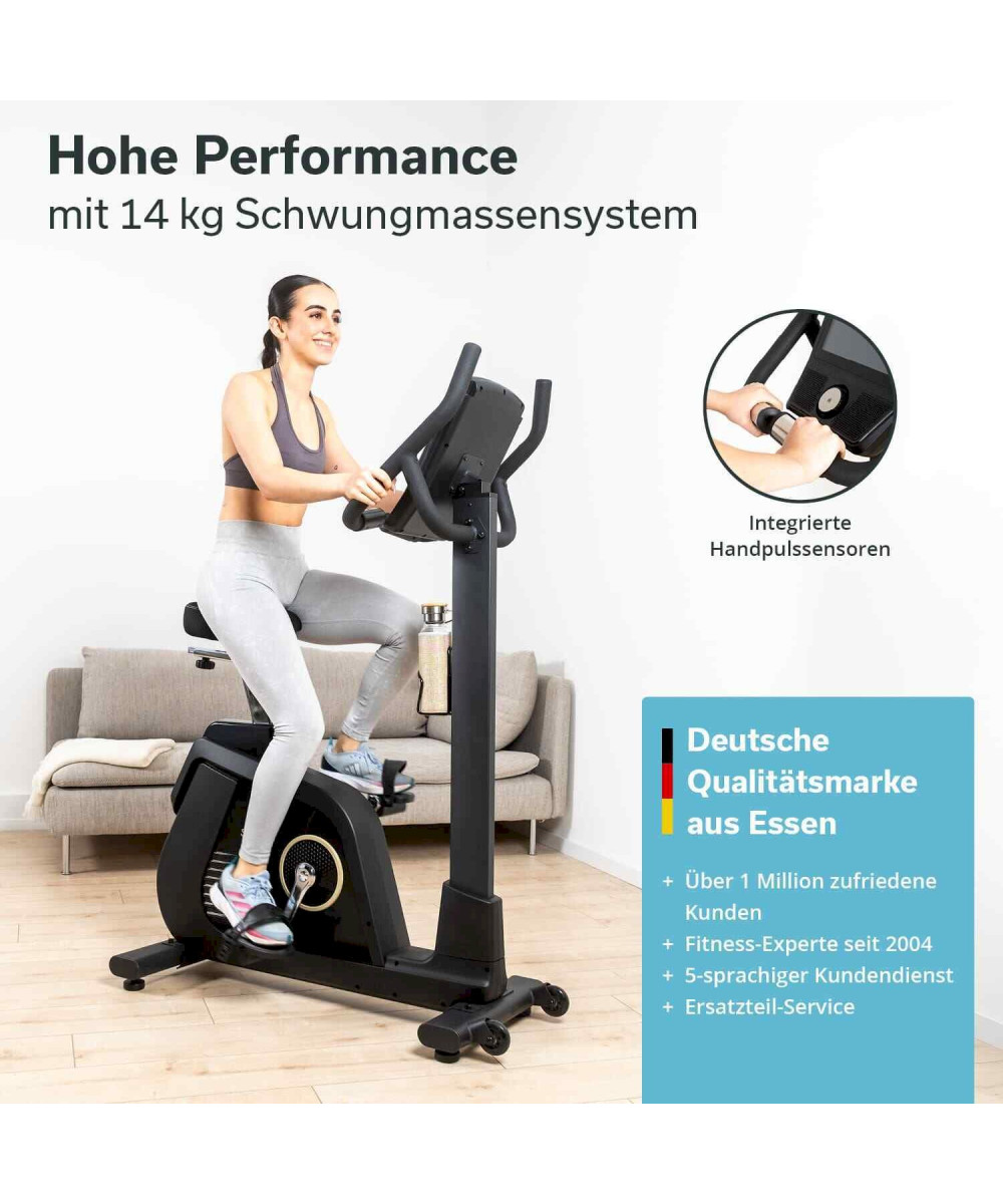 - 14 kg Schwungmassensystem, tiefer Einstieg, integrierte Handpulssensoren, Getränkehalter
