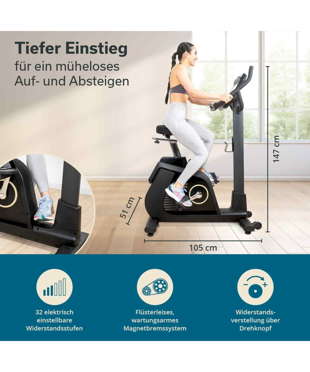 Der tiefe Einstieg für ein müheloses Auf- und Absteigen, das Schwungmassensystem von 14 kg und das wartungsarme, motorisierte Magnetbremssystem sorgen für ein komfortables Fahrerlebnis mit einem natürlichen und leisen Bewegungsablauf. Die 32 elektrisch einstellbaren Widerstandsstufen unterstützen das zielgerichtete Training.